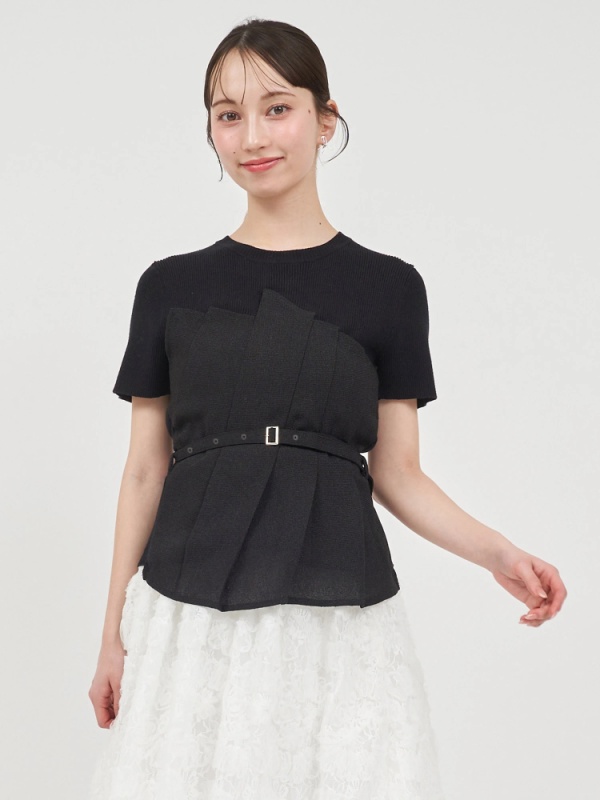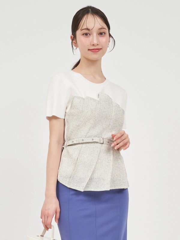 シンプルなリブニット×上品なサマーツイードをドッキングしたトップス。