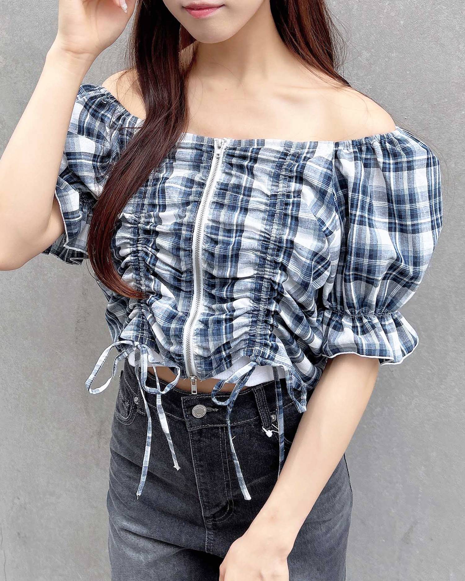 1251-200443 チェック柄ドロストジップオフショルブラウス