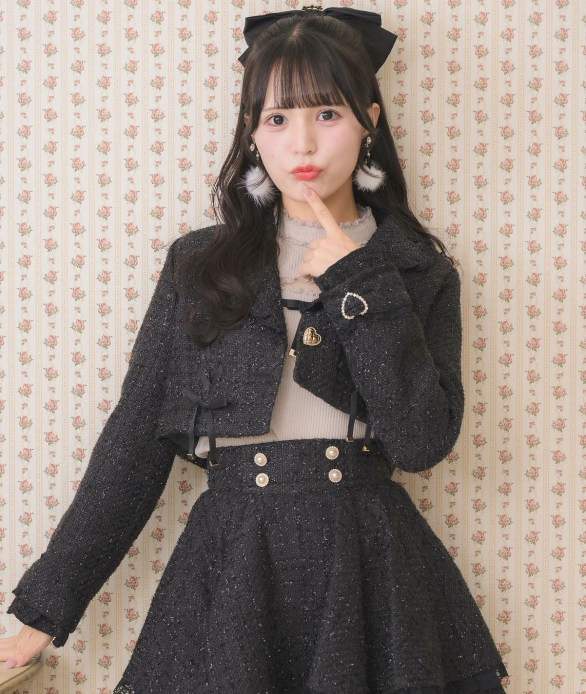 ダブルフレア裾レーススカート(※別売り)とセットアップが可愛い♡所々にハートやリボンを取り入れたディテールが乙女心を擽ります。ブラックとピンクはラメ入り素材で綺麗めに、新鮮なネイビーは季節感のあるチェック柄を取り入れ洗練された雰囲気をプラスしてくれます。