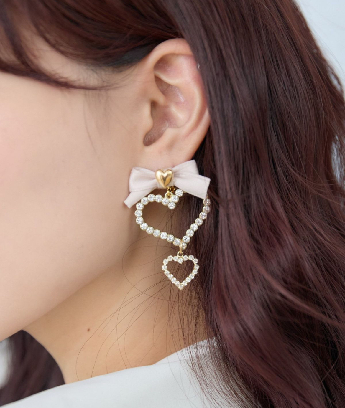 トリプルのハートが連なったガーリーニュアンスのイヤリング。ゴールドメタルが上品にアシストしてくれ、キラキラなビジュがお顔周りを華やかにメイクアップしてくれること間違いなし◎レディライクにとことん仕上げたい日におすすめのアイテムです