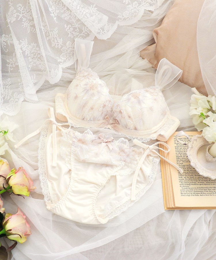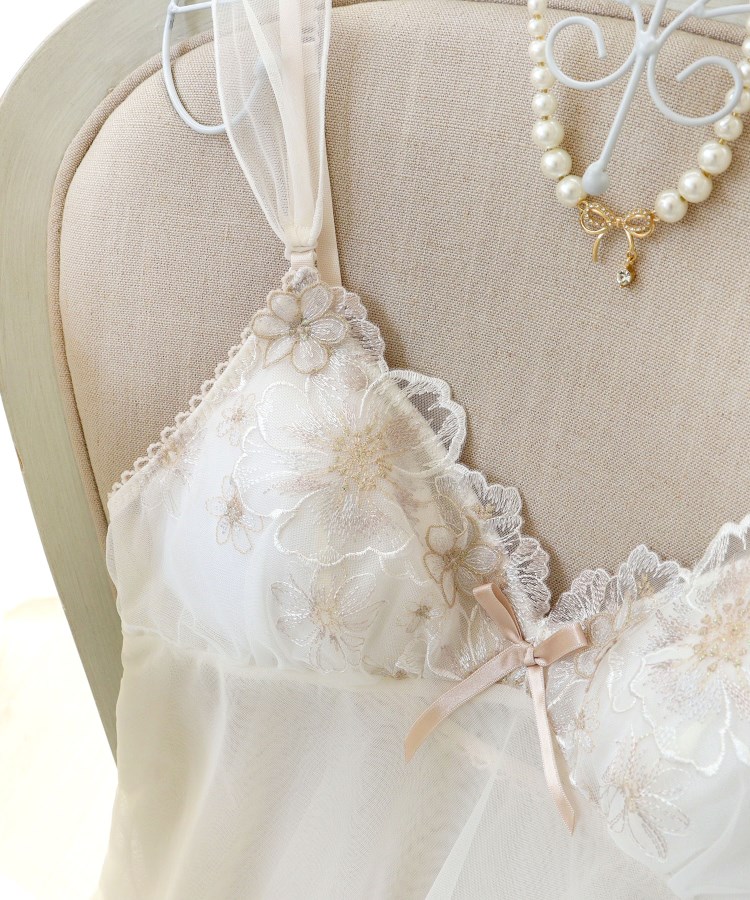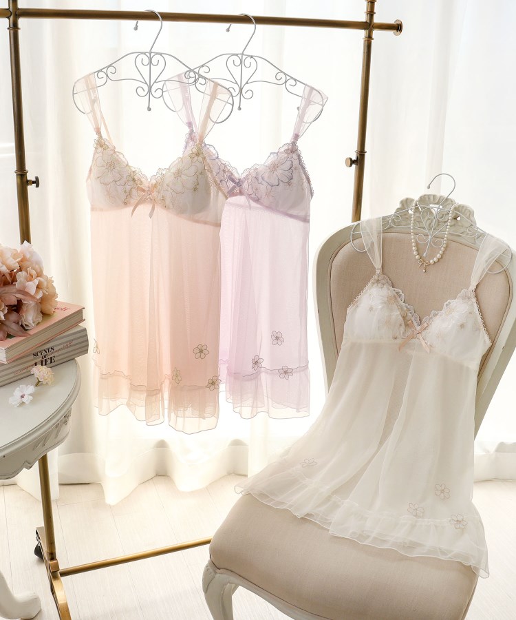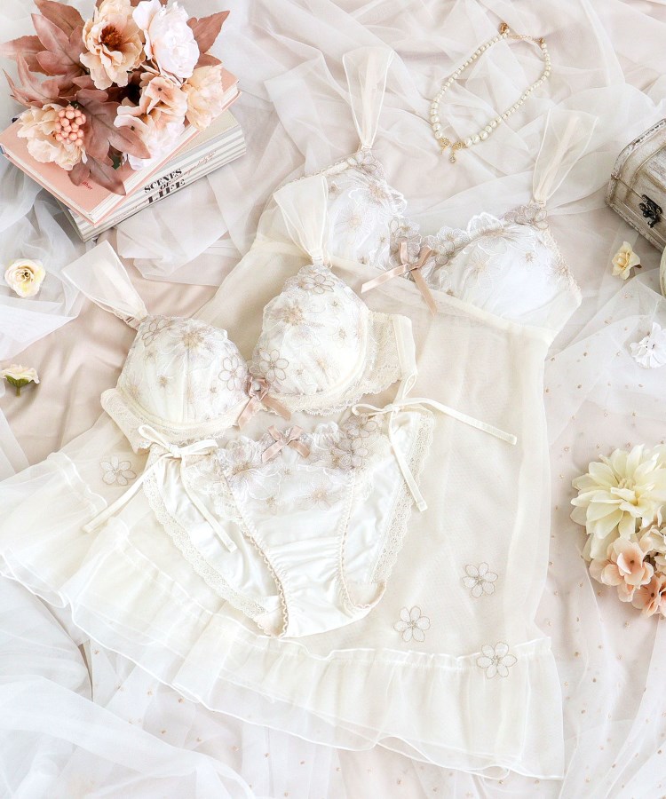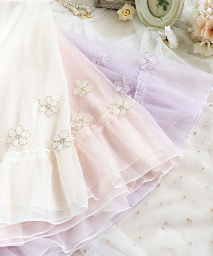 アネモネのお花を大胆に刺繍したレースは、存在感あふれる印象の中に繊細なステッチをあしらうことで、可愛らしくガーリーに仕上がりました。サイドにはラメ糸をたっぷりとほどこした小さなお花のアップリケを重ねて、奥行き感をプラス。様々なお花がレース全体に咲きほこっているような、華やかさを演出しました。カラーは淡いグラデーションでまとめて、チュールやアップリケのシアー感を引き立たせた、ロマンティックなコレクションです。