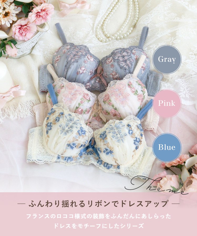フランスのロココ様式の装飾をふんだんにあしらった、ドレスをモチーフにしたシリーズです。ドレスの胸元のリボンをイメージしたチュールアップリケは、大胆に重ね付けすることで、豪華なクチュール感を演出。繊細なグラデーションと丸みのあるシルエットで、手でふわっと結んだようなやわらかい印象に仕上がりました。周りにはリボンの編み上げデザインや、可憐に咲く花々をあしらい、お花は密度のあるステッチで立体的に。全体にキラキラと輝くラメ糸をほどこした、思わず心ときめくロマンティックなデザインです。