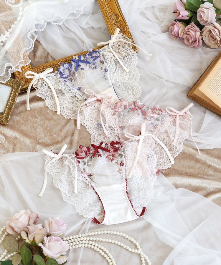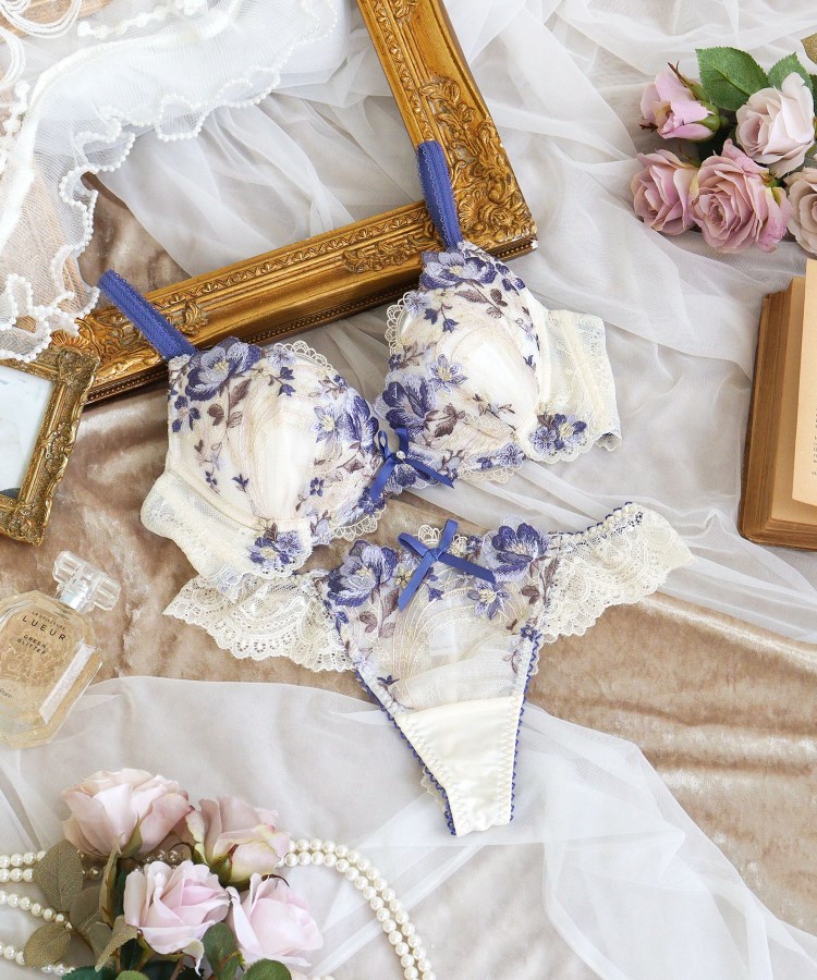 バラのお花と扇形模様を組み合わせた、豪華でエレガントなシリーズです。レース全体に咲きほこる大輪のバラは、大胆なカラーリングでインパクトを持たせつつも、女性らしい印象に。周りには様々な小花の刺繍や小さなアップリケをあしらい、可愛らしさをプラスしました。扇状に描かれた模様は扇の線1つ1つに変化をつけ、2色のラメ糸をふんだんにほどこすことで、バラの存在感を引き立てたより一層の華やかさを演出。バスト中央には立体的なストーンをあしらい、豪華なエンブレースに劣らない1粒の輝きが、身に着けるたび心をときめかせてくれるようなランジェリーに仕上がりました。