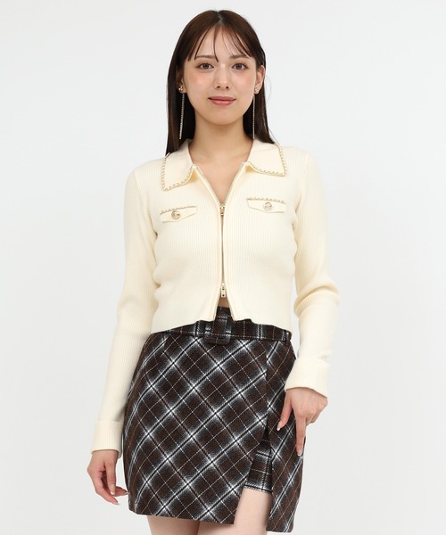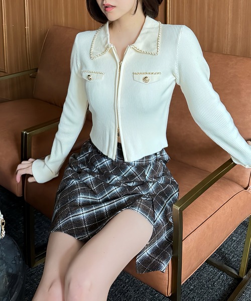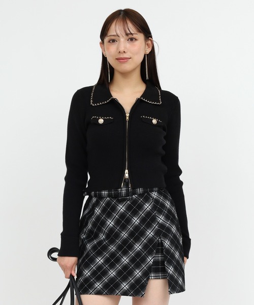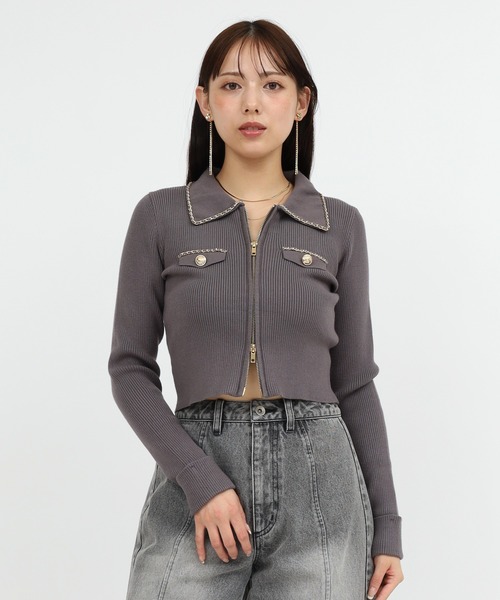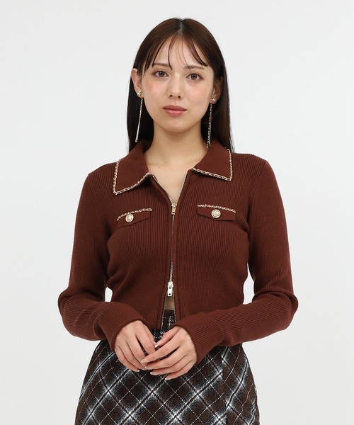 ベロアチェーントリミングデザインと胸元のゴールド釦がアクセントとなり目を惹く長袖ニットトップス。