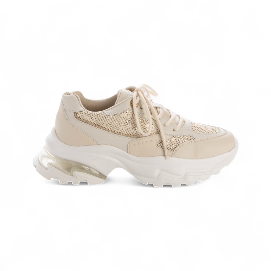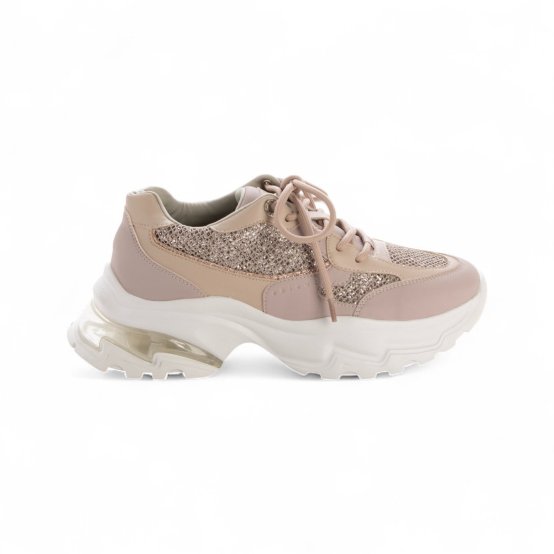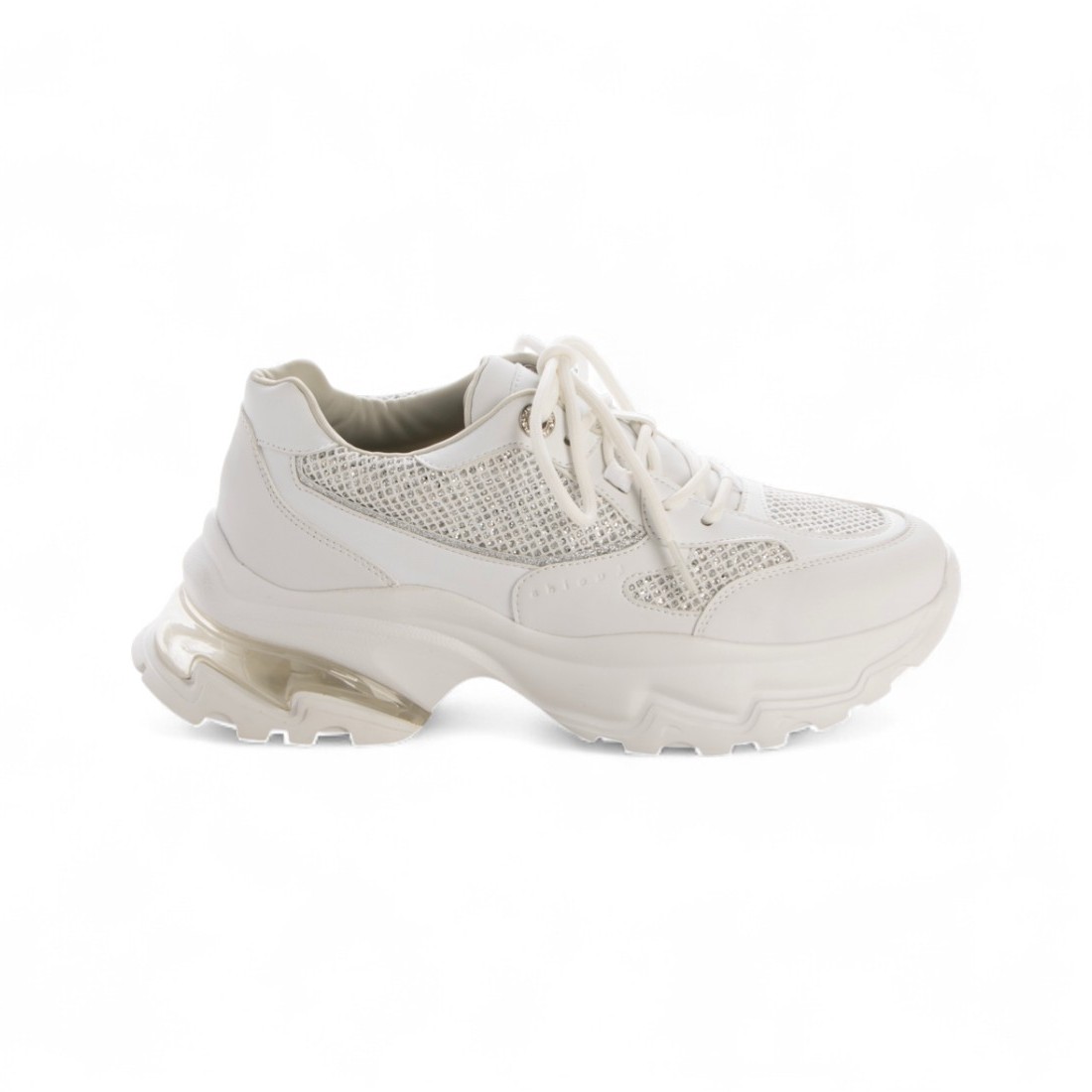 メッシュにあしらった繊細なグリッターが、歩くたびにさりげなく輝きを放つ一足。厚底ソールが足元にボリュームを与えつつ、軽やかな抜け感を演出。モノトーンやニュアンスカラーのコーデにも映える、上品で華やかなスニーカーです。🌟