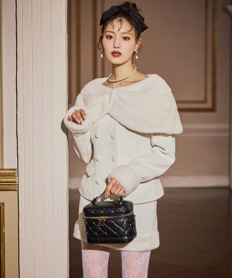 肩まわりと袖口にあしらったファーが、クラシカルなツイードに女性らしい華やぎをプラス。