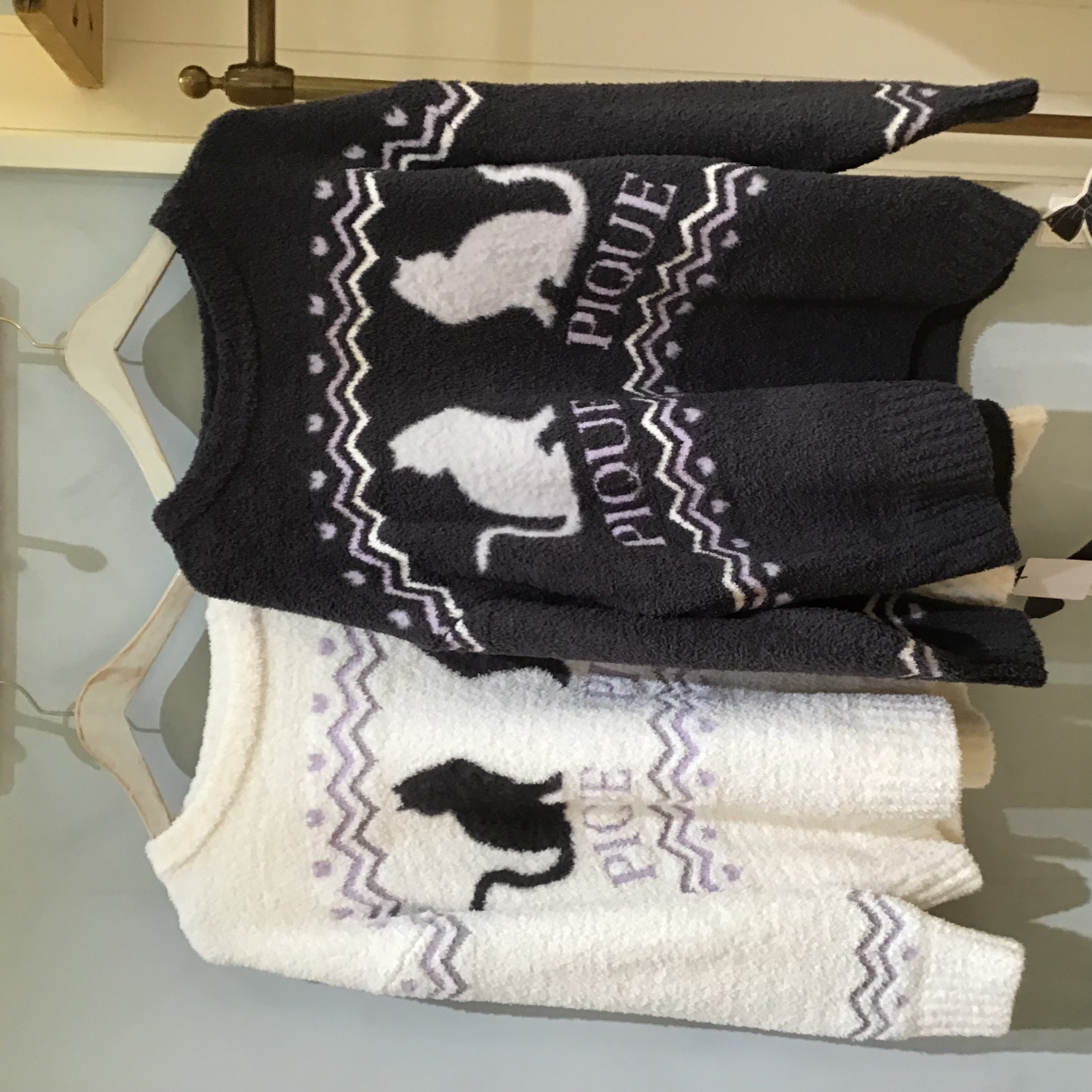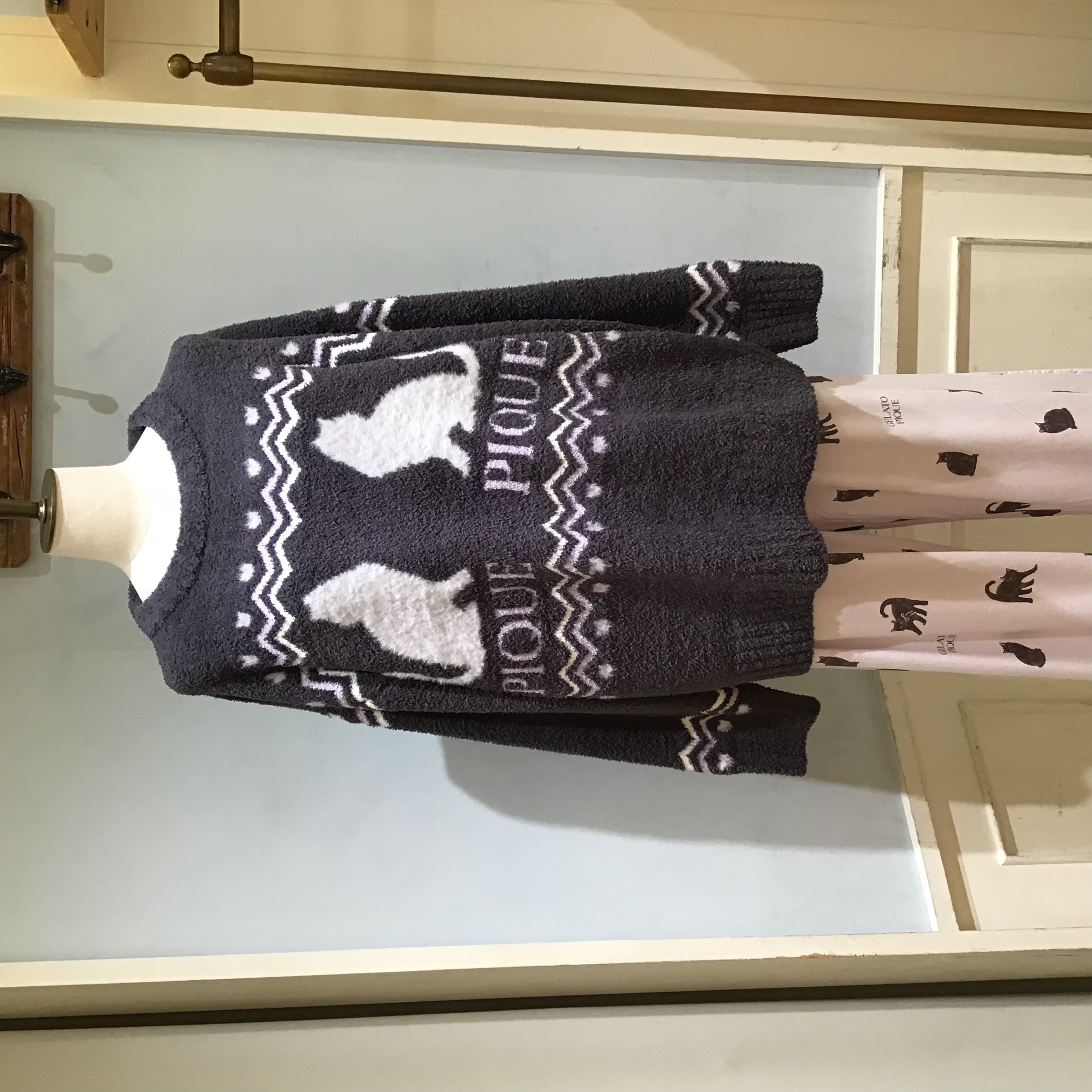 温かみのあるノルディック柄の中に、ファーの黒猫とハート、PIQUEロゴを大胆にデザインしたジャガードプルオーバーです。