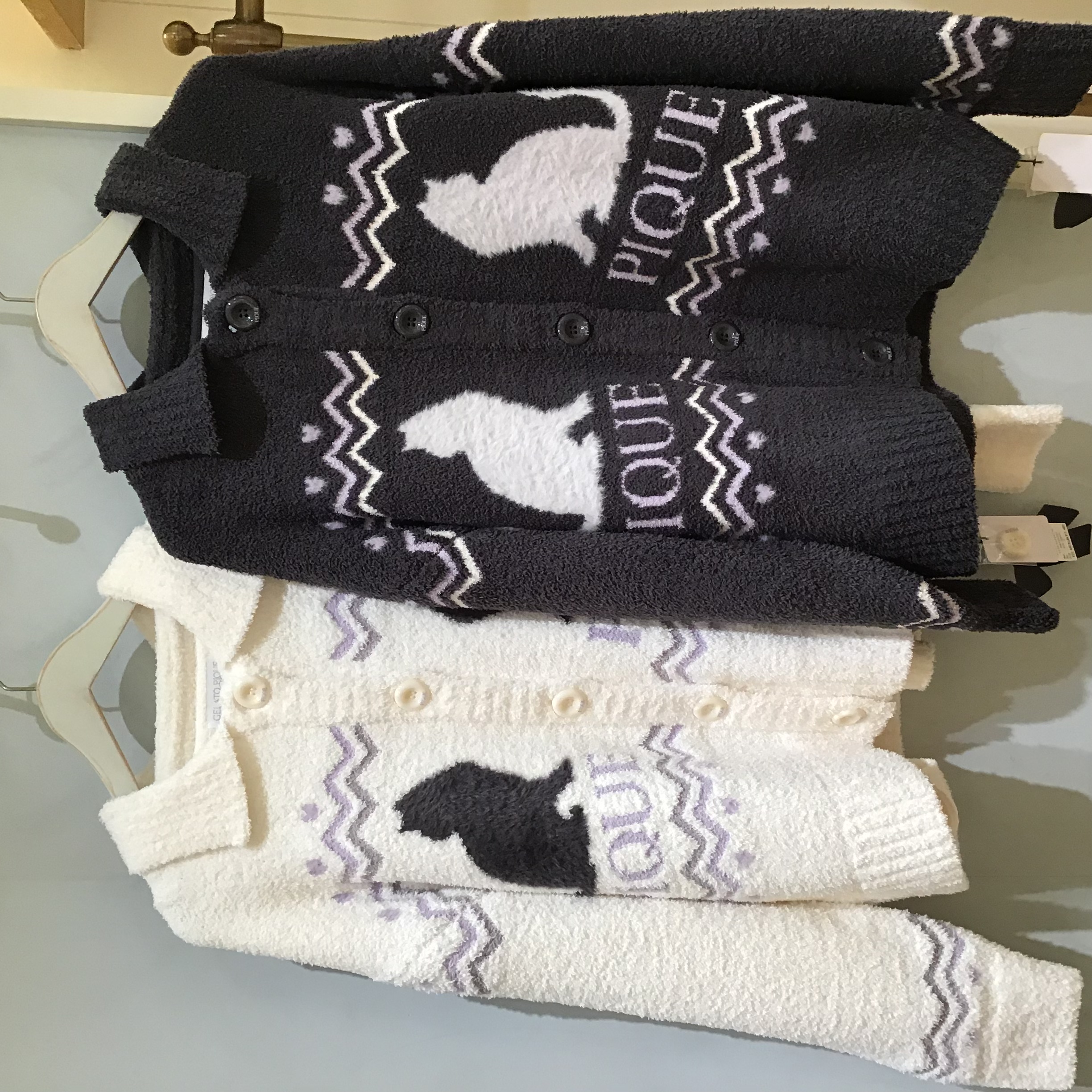 温かみのあるノルディック柄の中に、ファーの黒猫とハート、PIQUEロゴを大胆にデザインしたジャガードカーディガンです。