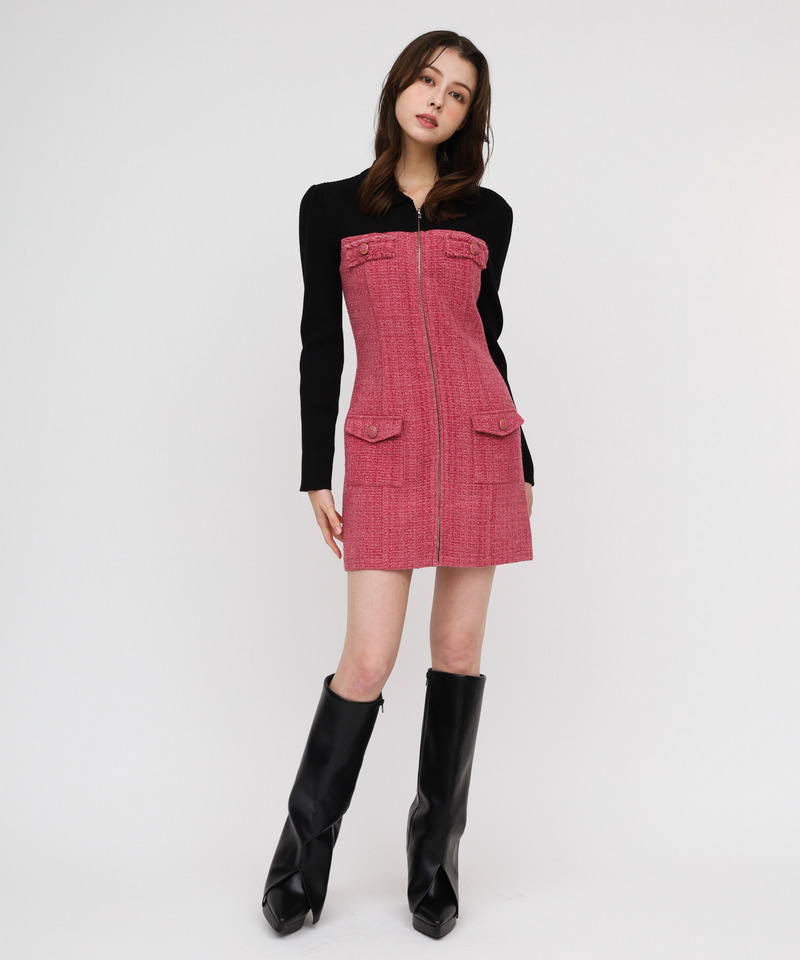 上品且つ表情豊かなツイード生地とニットをドッキングした特別感溢れるミニワンピース。