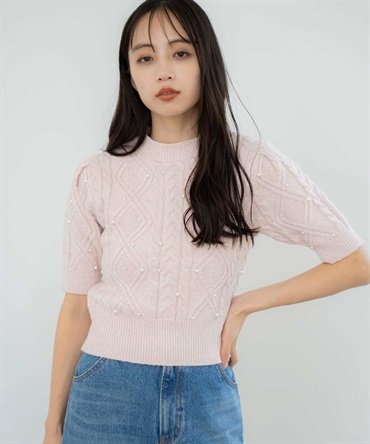 大小さまざまなパールをランダムに散りばめ、華やかでフェミニンな印象を演出したケーブルニット。