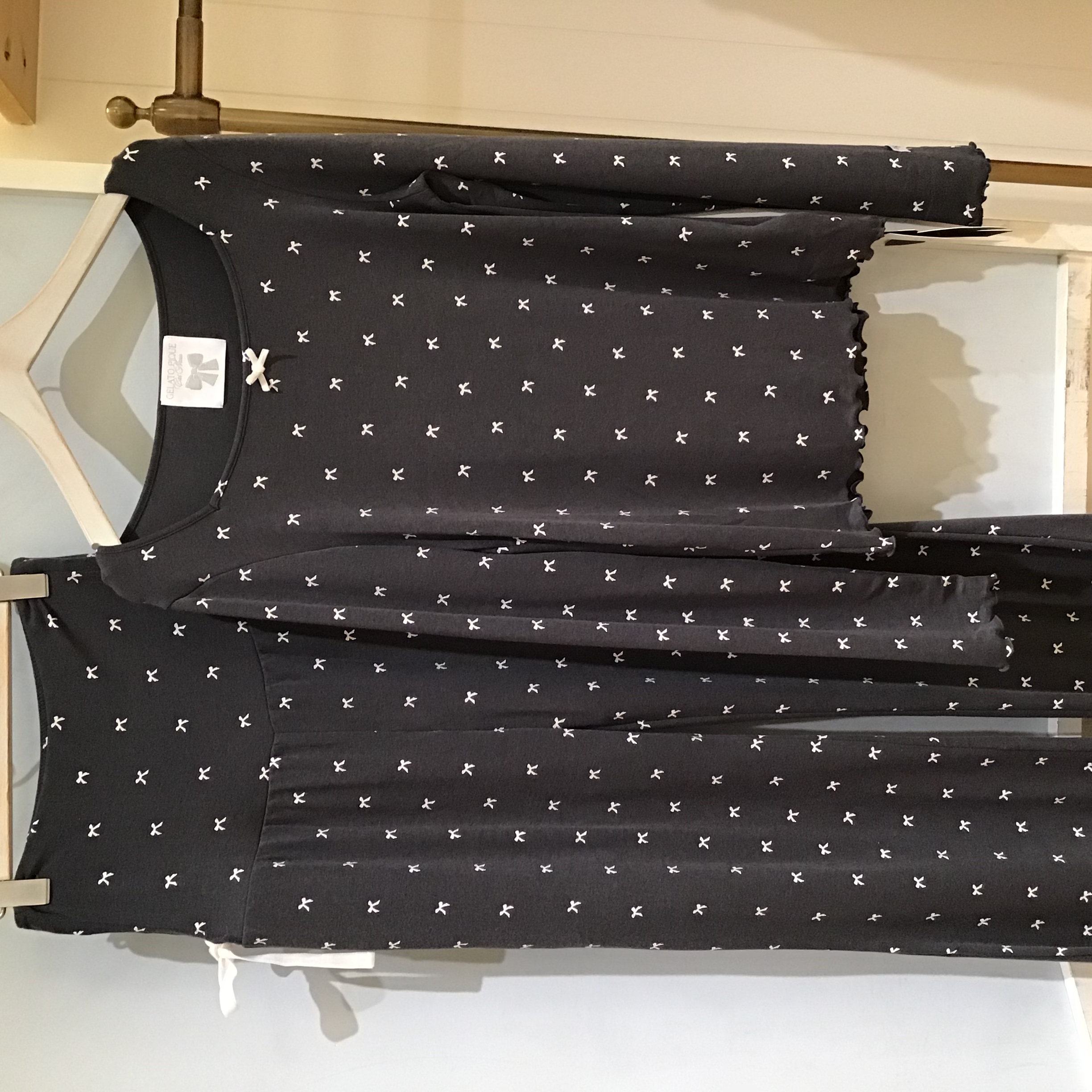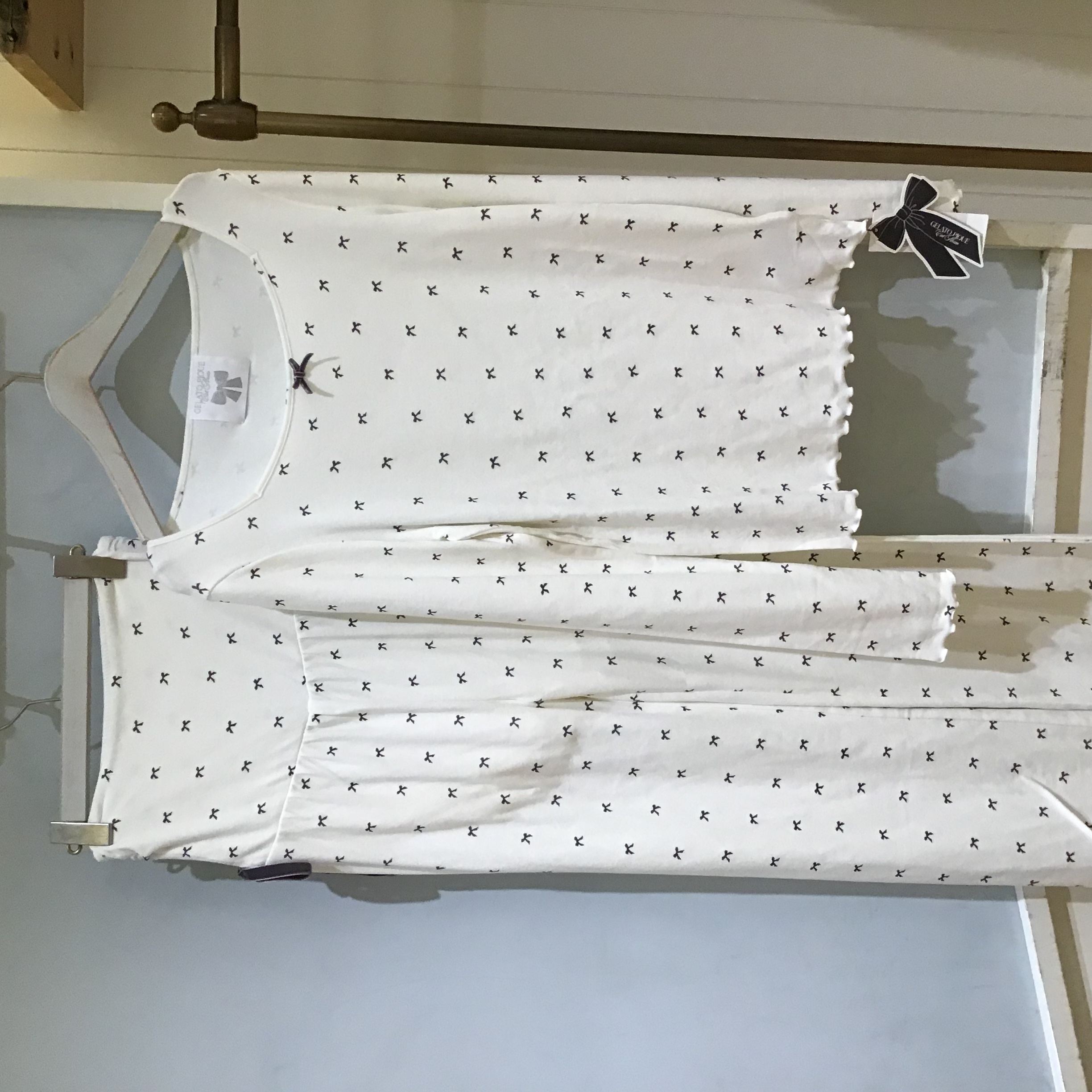 ソフトな風合いの針抜きカットソーに、ドット見えする小さなリボンプリントをあしらったプルオーバーです。メローの裾と袖口、上品なスクエア調の胸元に添えた小さなベロアリボンがアクセント。1枚でも、ワンピース等のインナーにも着用いただけるデザインです。同シリーズのニットカーディガンやロングパンツとのコーディネートがおすすめです。