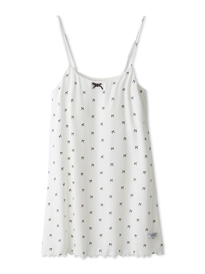 ソフトな風合いの針抜きカットソーに、ドット見えする小さなリボンプリントをあしらったカップインタイプのキャミソールです。メローの裾と、胸元に添えた小さなベロアリボンがアクセント。左裾にワンポイントで織りネームも添えました。ヒップが隠れるくらいの長めの丈感なので、レギンス合わせや、羽織りものをプラスしたレイヤードスタイルなどもお楽しみいただけます。同シリーズのニットカーディガンやロングパンツとのコーディネートがおすすめです。