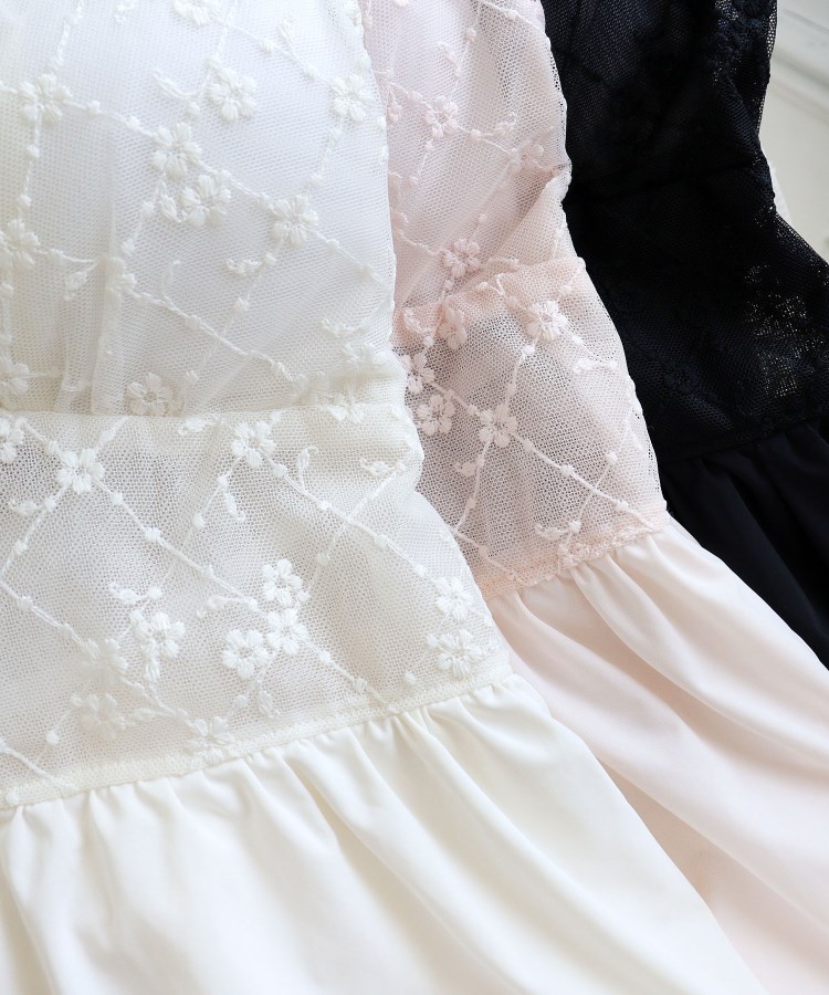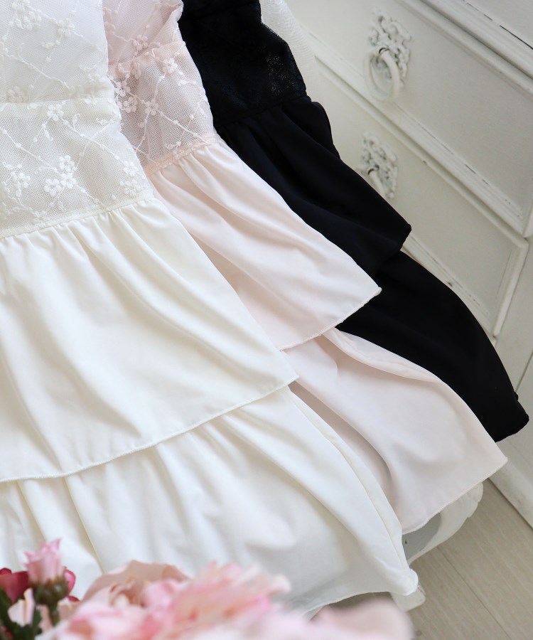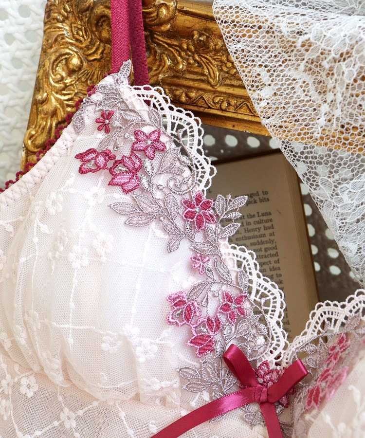 お花たちが咲きほこるガーデンをイメージした、レトロ感のあるシリーズです。カップからカップ下全体に小花を散りばめた格子柄のレースは、レースと同じカラーのあたたかみのあるウーリー糸で刺繍することで、ナチュラルな可愛らしさに。その上からクレマチスのお花をイメージしたケミカルレースを重ねて、お花たちがガーデンの柵に絡まり合って咲いている華やかな様子を表現しています。身生地には伸縮性のある素材を2段であしらい、フリルのようなデザインに。動くたびにふんわりと揺れて、女の子らしい可憐なスタイルをお楽しみいただけます。異なるレースやアップリケ、刺繍糸をミックスすることで、レトロなクラフト感のある印象に仕上がりました。