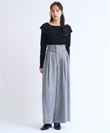 ハイウエストとウエストのタックで、すっきりとしたシルエットに仕上げたワイドパンツ。