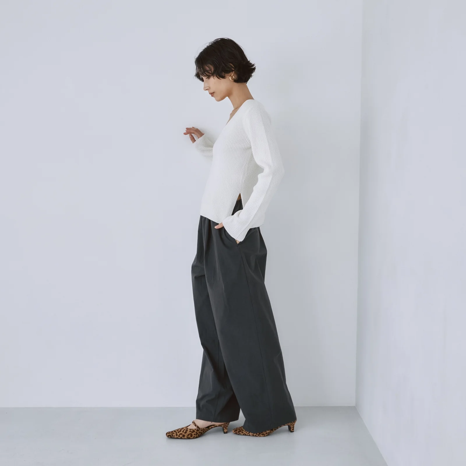 ヒップ周りにゆるさとボリュームを持たせつつ、脚はボリュームダウンさせ、ストレートに落ちる絶妙なシルエット。パターンを細かく調整しているため、バランス良くスッキリとご着用いただけます。