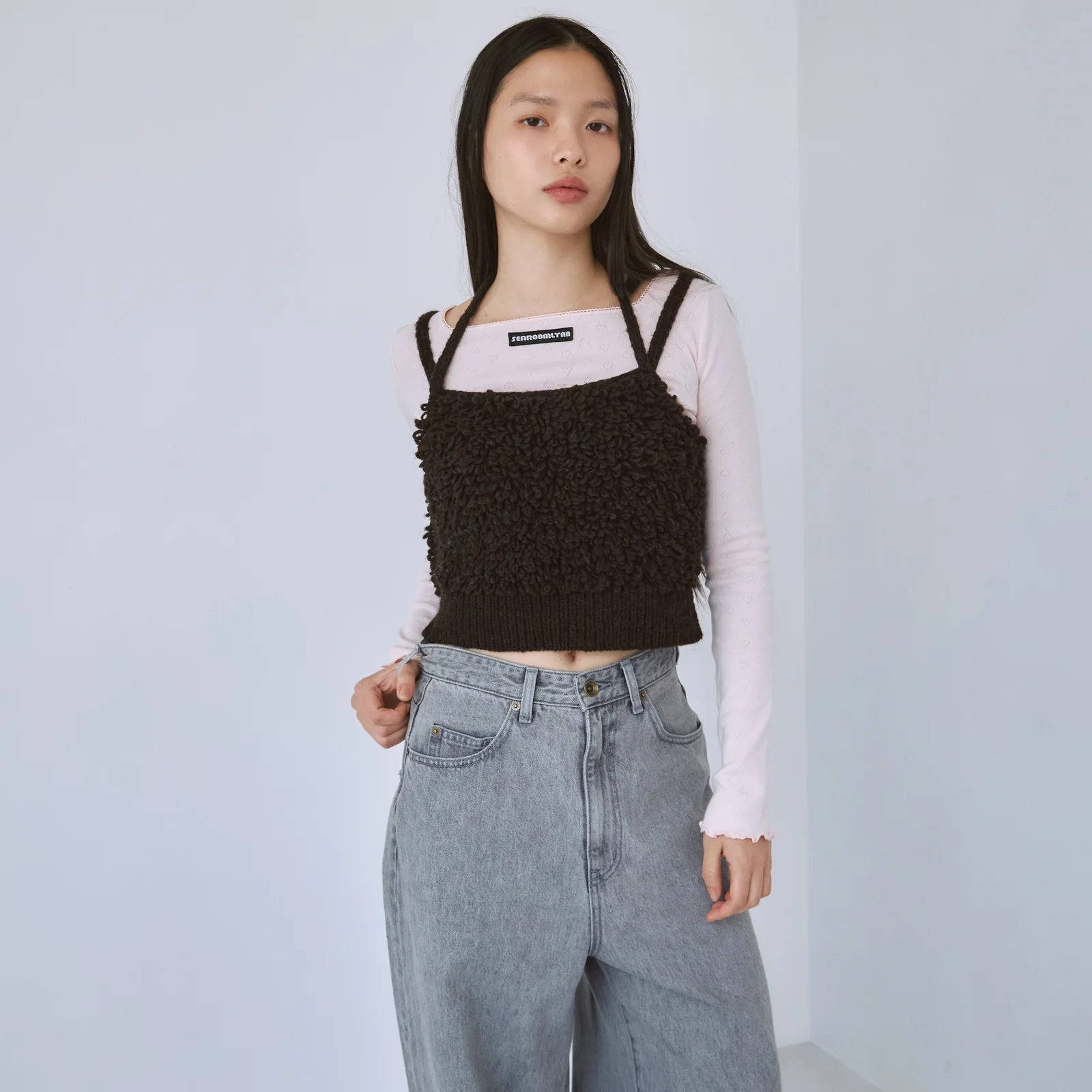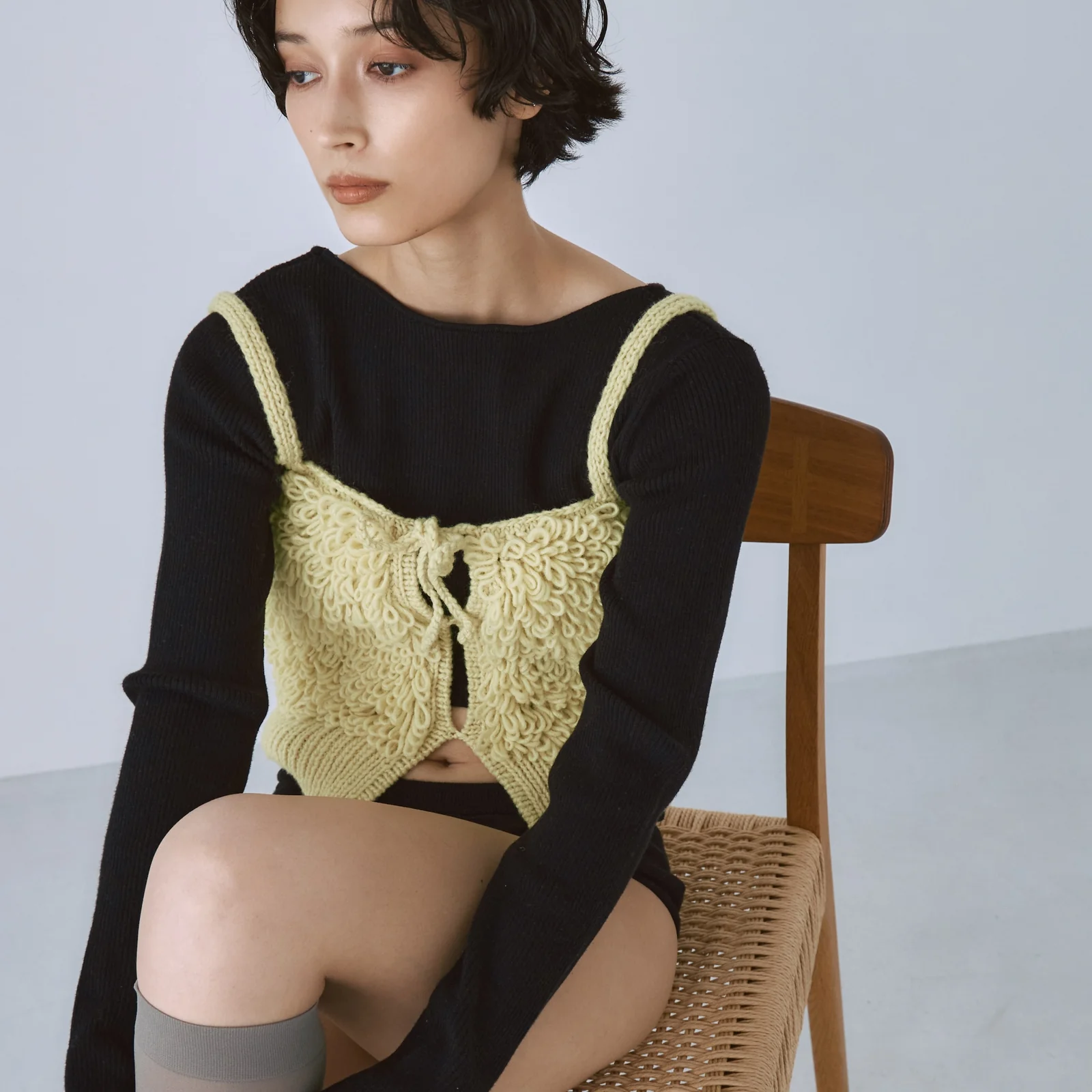 ペルー産ハンドメイドニットならではの太糸を使った優しい表情が特徴のビスチェ。リボンやホール、ロングストラップなどデザイン性たっぷりの1枚。レイヤードができて前後2WAYの万能アイテムです。