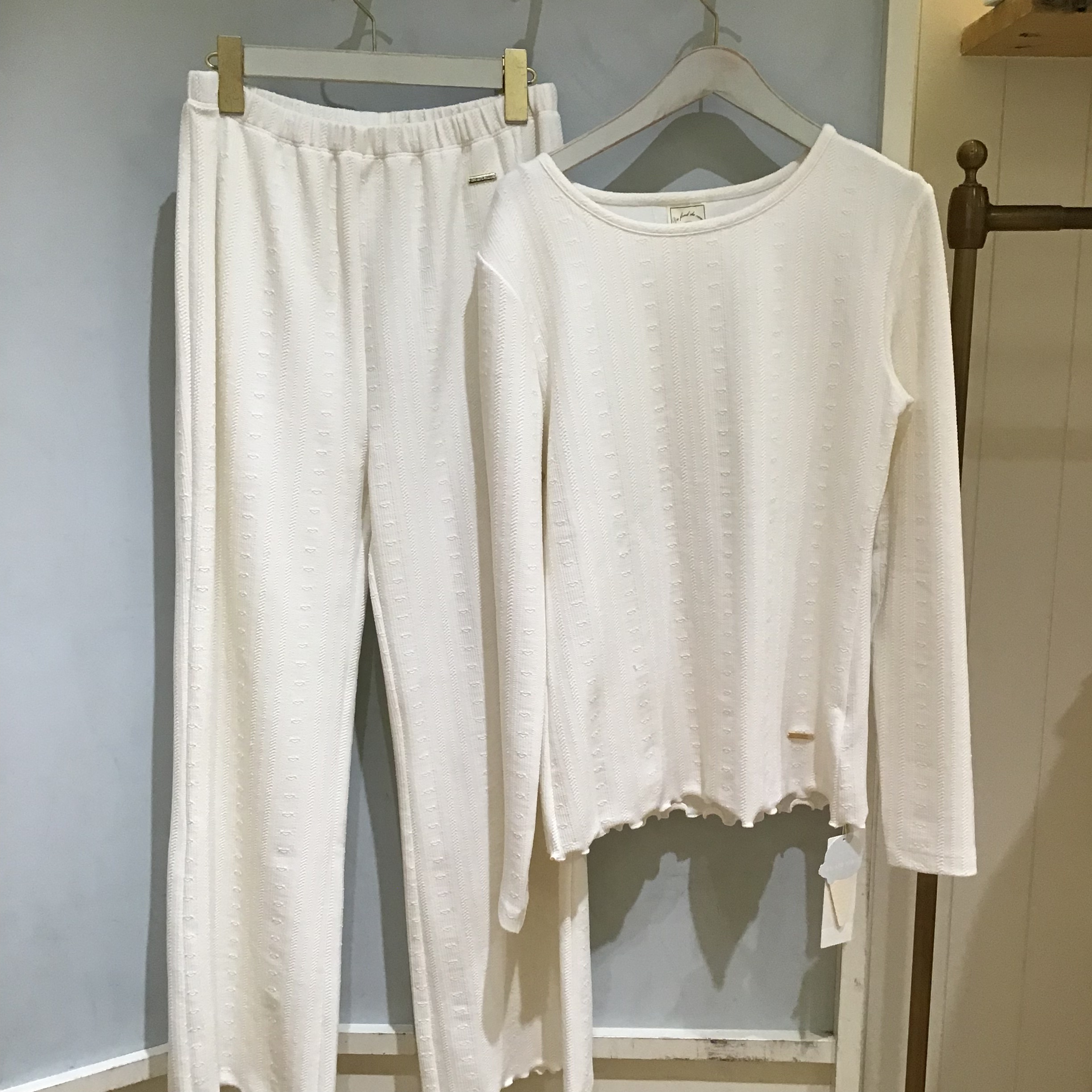小さなハート柄のアラン模様を、ふくれジャガードで表現したカットソーシリーズ。肌寒い時期のインナーに重宝する、シンプルでストレッチ性に富むプルオーバーです。シルエットはすっきりとしていますが、袖丈や着丈が長めで上半身をしっかりとカバーするので、安心感のある着心地。ゆとりのあるストレートシルエットでリラックス感を出した、シンプルなロングパンツです。伸縮性に富むカットソーなので、動きやすさも抜群。シリーズ共通であしらったゴールドのプレートがさりげないアクセントになっています。色はクリームとブラウンの2色をご用意。