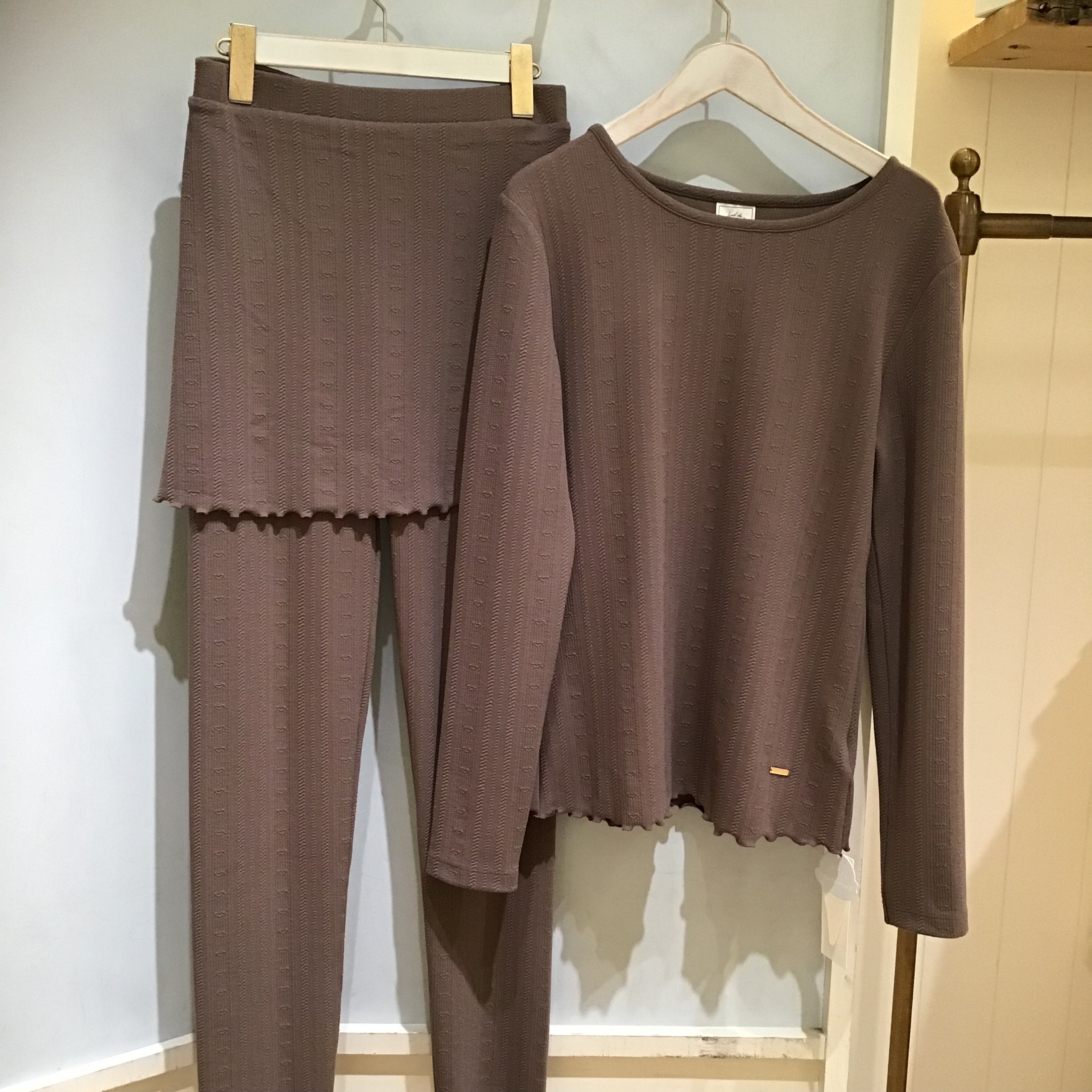 ミニスカートがドッキングした、下着の透けが気にならないレギンスです。伸縮性に富むカットソーなので、動きやすさも抜群。シリーズ共通であしらったゴールドのプレートがさりげないアクセントになっています。色はクリームとブラウンの2色をご用意。同シリーズのプルオーバーに合わせたり、同時期に展開するハート柄ニットシリーズとのコーディネートもおすすめです。