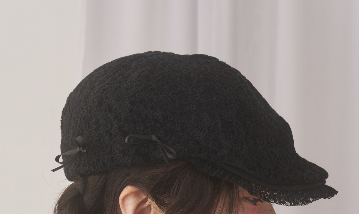 トレンドのハンチングキャップを、甘く淡い柔らかな雰囲気に仕上げています〇