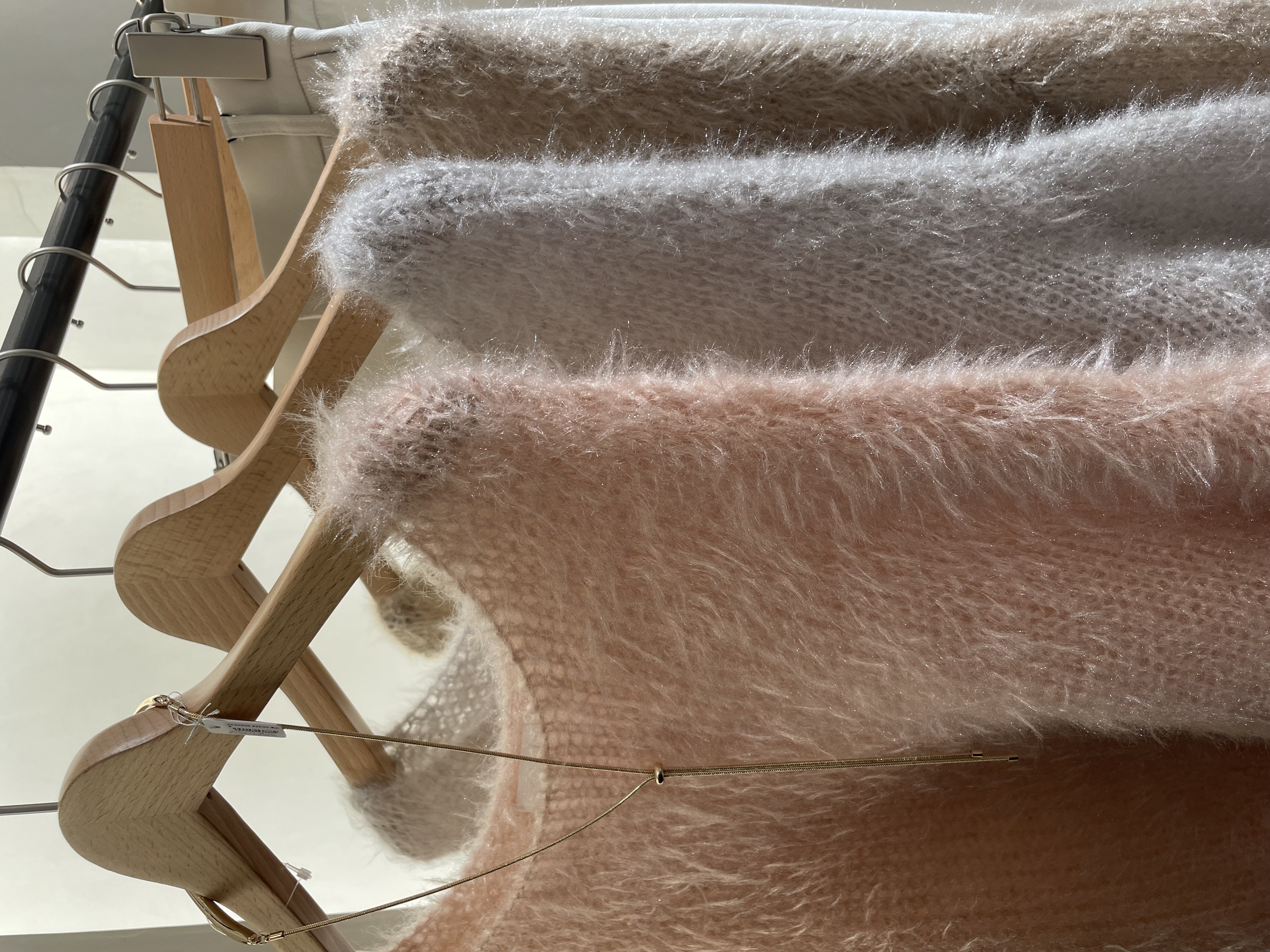 フェザーラウンドニット やや透け感のあるゆるく編んだ生地感が女性らしい1枚 ふわっとした毛足の長いフェザーが着心地◎ 微光沢でつやっとした生地感が大人女子なニットです♪