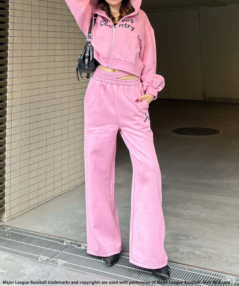 トップスはややワイドなショート丈シルエットにフルジップ仕様で、スタイリングしやすく抜け感もプラス。胸元には視線を引き寄せる各球団のニックネームをデザインとしてあしらい、今っぽいストリート感を演出します。ボトムは脚長効果のあるフレアシルエットに、片側ウエストのスリットから覗く肌見せデザインでエッジを効かせた一本。フロントに振った切り替えラインが縦のラインを強調し、すっきりと見せてくれるのもポイント。