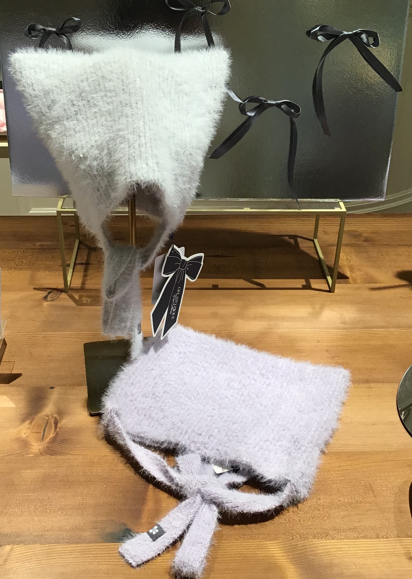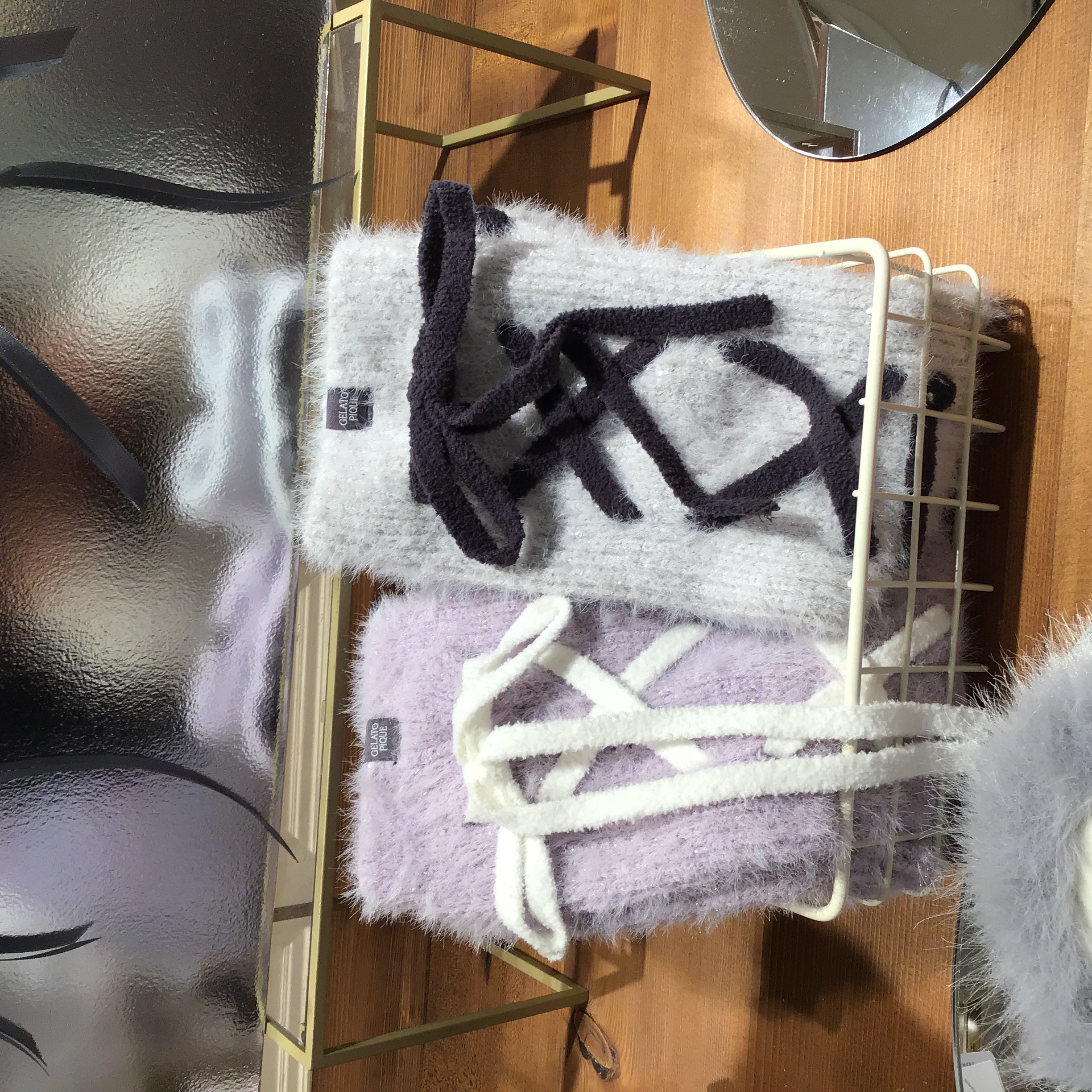 トレンドのリボンをフィーチャーした女子ライクなモノトーンスタイル。同シリーズのニットウェアと同じ’フェザー’ニットを使用した、編み込みのリボン付きレッグウォーマーです。雑貨アイテムのみラメとスパンコールを施して、キラキラした質感に仕上げているのがポイント。同シリーズのフェザーニットのウェアや、雑貨シリーズと合わせるのがおすすめです🎶