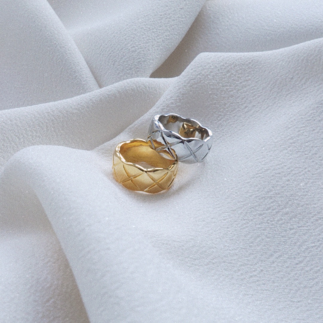 単体使いでもメリハリのある手元へと魅せてくれるワイド幅のピンキーリング💍✨ キルティング模様で高級感ある仕上がりに💎✨