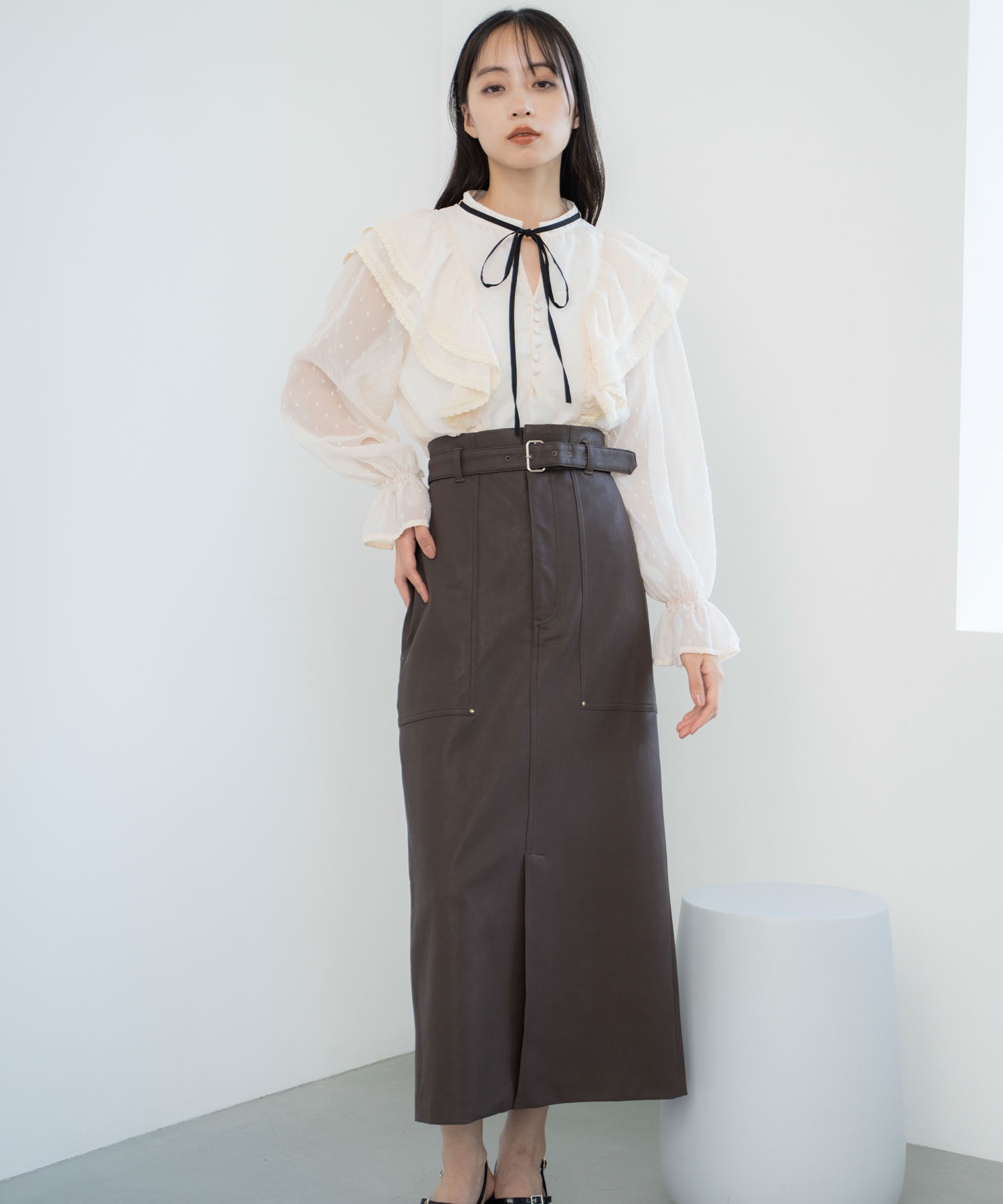 配色リボンドビードットブラウスとのコーディネートがおすすめです。