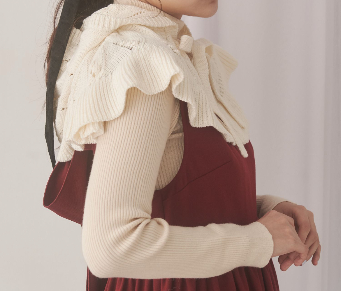 柔らかなフリル裾やあご下のリボン、ぽんぽんとした透かし柄でかわいらしさをたっぷりとプラスしました。