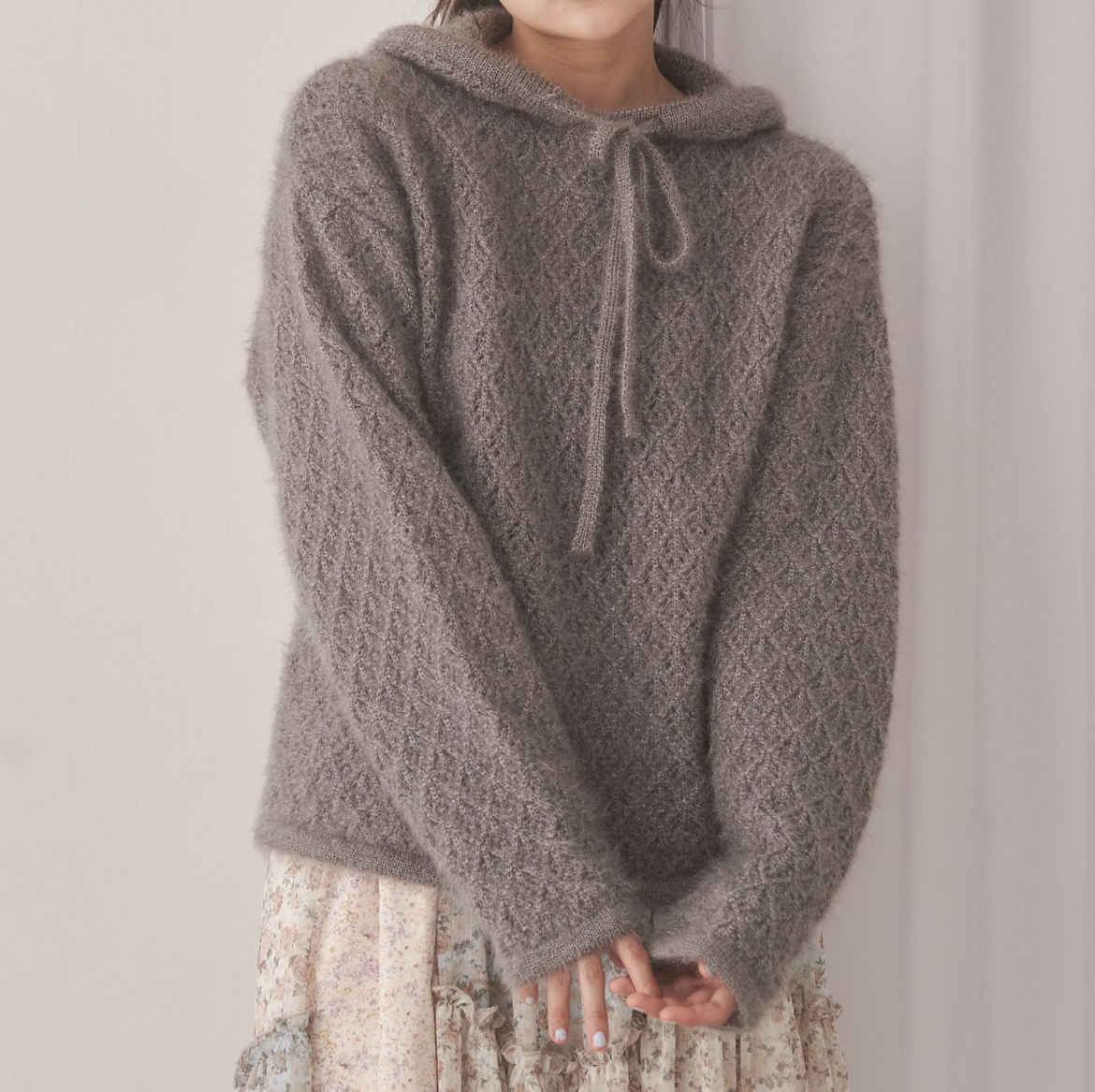 控えめにきらっとしたラメ糸を混ぜ込んだ、うさ耳透かし編みニットトップス〇
