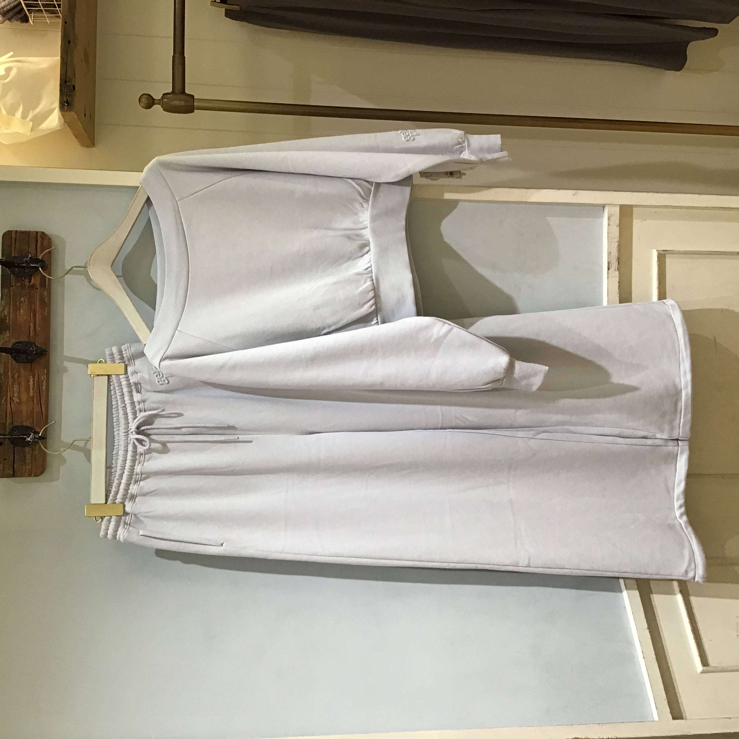 裏面が微起毛のやわらかいコットン混裏毛のスウェットを使用した、カジュアルでトレンド感のあるシリーズです。襟ぐりを大きく開けたプルオーバーは、オフショルダーっぽくも着こなせる1枚。ラグランスリーブと短め丈のスポーティな印象の中に、女性らしさがほんのり漂います。左袖にワンポイントでエンボス加工のブランドロゴを入れました。色はくすんだ風合いのブルーとグレーの2色展開。同シリーズのロングパンツに合わせて、ワンマイルや機内着などにもおすすめです。