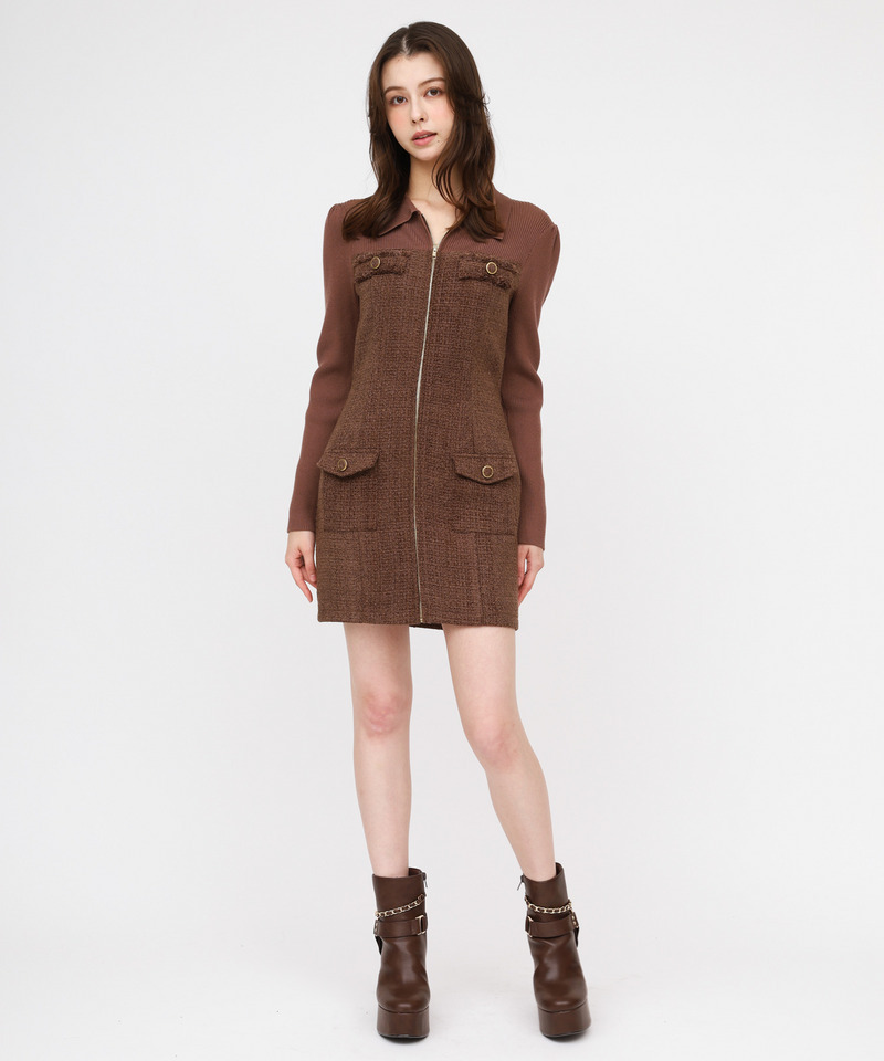 上品且つ表情豊かなツイード生地とニットをドッキングした特別感溢れるミニワンピース。