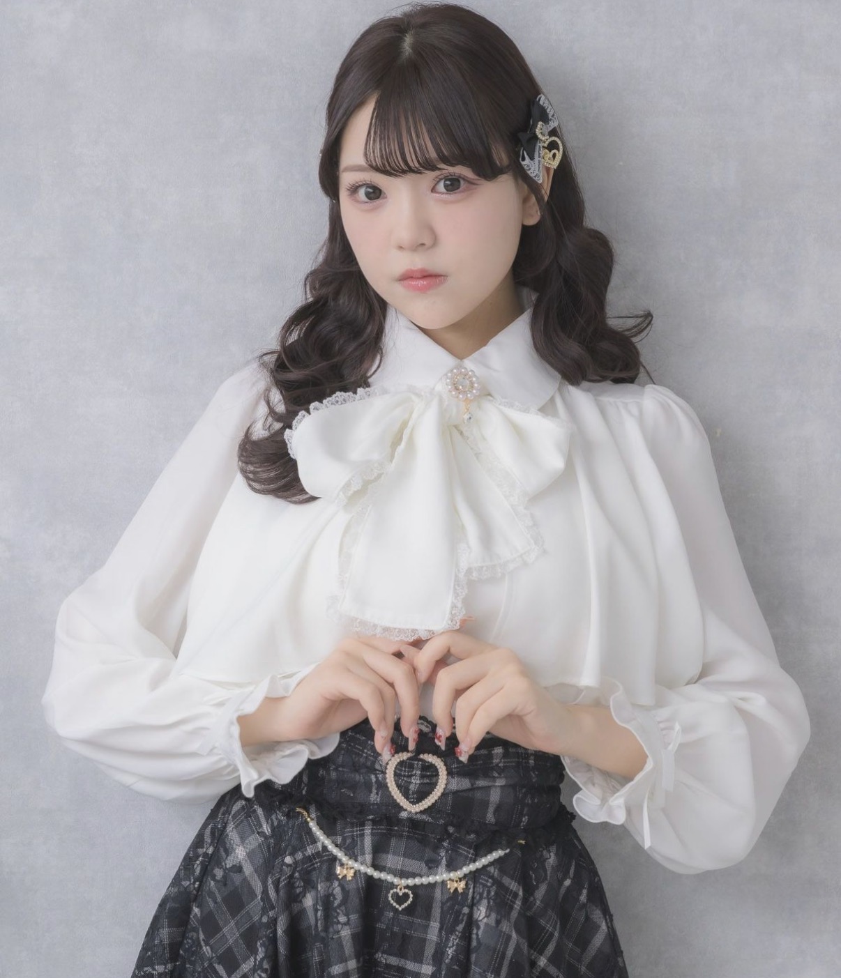 季節感アップ♡人気デザインが長袖になって再登場!首元のボウタイリボンが華やかさと可愛らしさをプラス。フレア感のあるケープデザインや艶めくハート釦で、とことん女の子らしい雰囲気に。レース配色がアクセントになった、一枚で華やぐブラウスです。