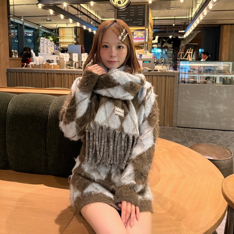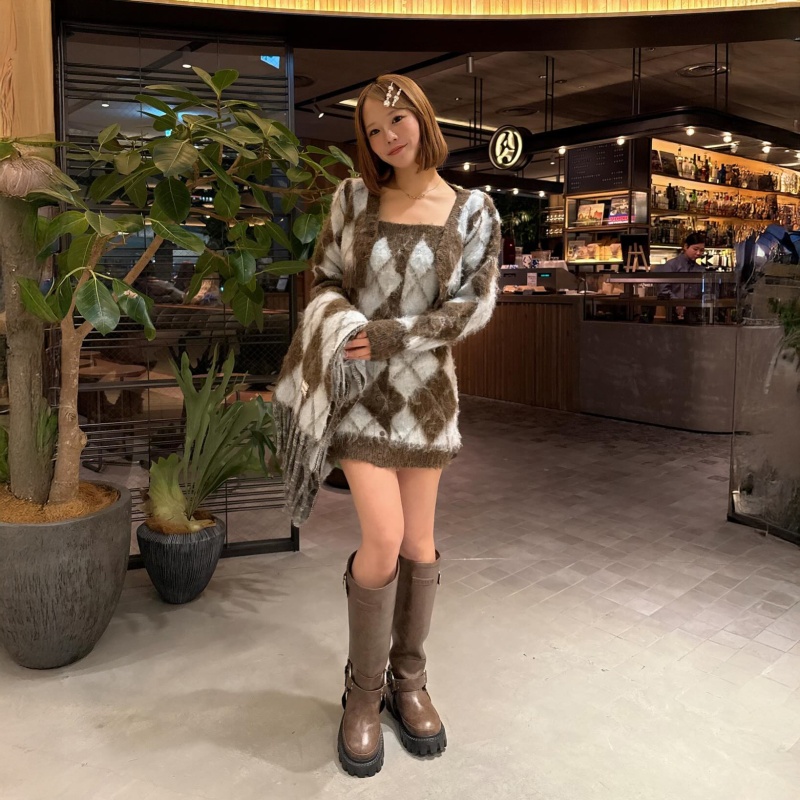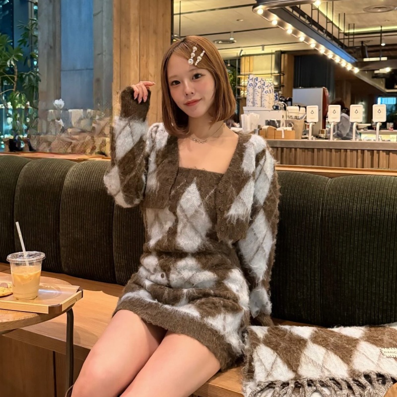 ふわっと柔らかなニット素材に、大きめのアーガイル柄が映えるニットアンサンブル♡ 着るだけでシーズンムードが高まる、大人可愛い冬の主役アイテム🩶