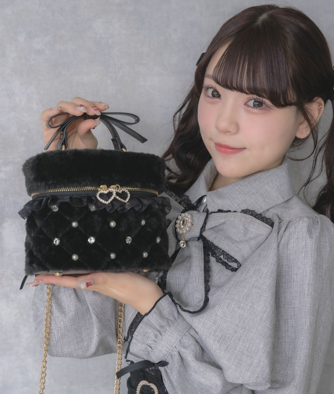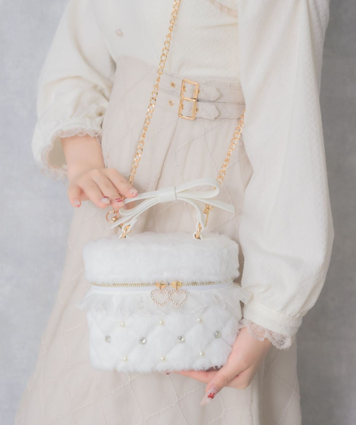 シーズンムード高まるファー素材に、キルティングステッチを組み合わせた上品なバニティバッグ。キルティングにはパールとビジューをランダムにあしらい、光を受けてさりげなくきらめく華やかなデザインに仕上げました♪内ポケット付きで使い勝手も良く、見た目以上の収納力◎