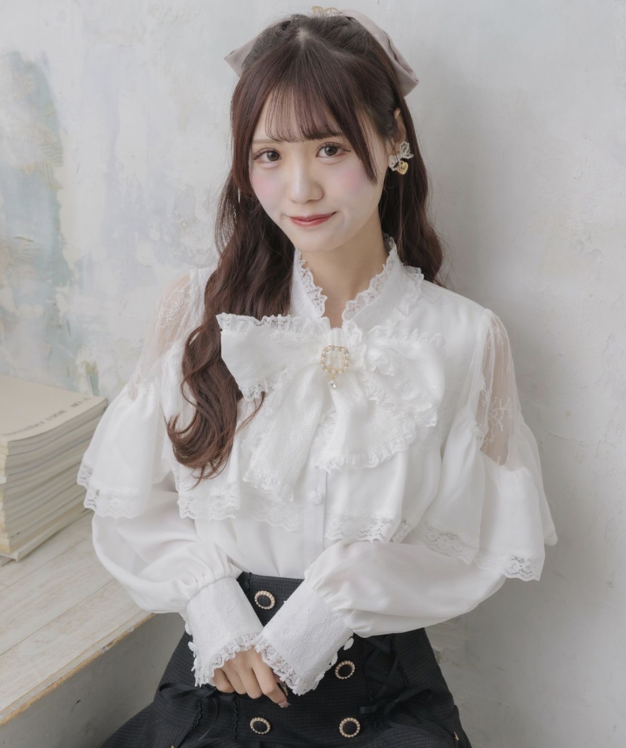 繊細なレースを重ねたボウタイがクラシカルな印象を添えるラッフルブラウス。カフスにもレースをあしらい、上品なバラ釦が手元に華やかさをプラスします。肩からふんわりと流れるケープ風デザインが、動くたびに優雅なシルエットを演出。可憐さと上品さを兼ね備えた、お姉様ガーリースタイルを叶える一枚です。