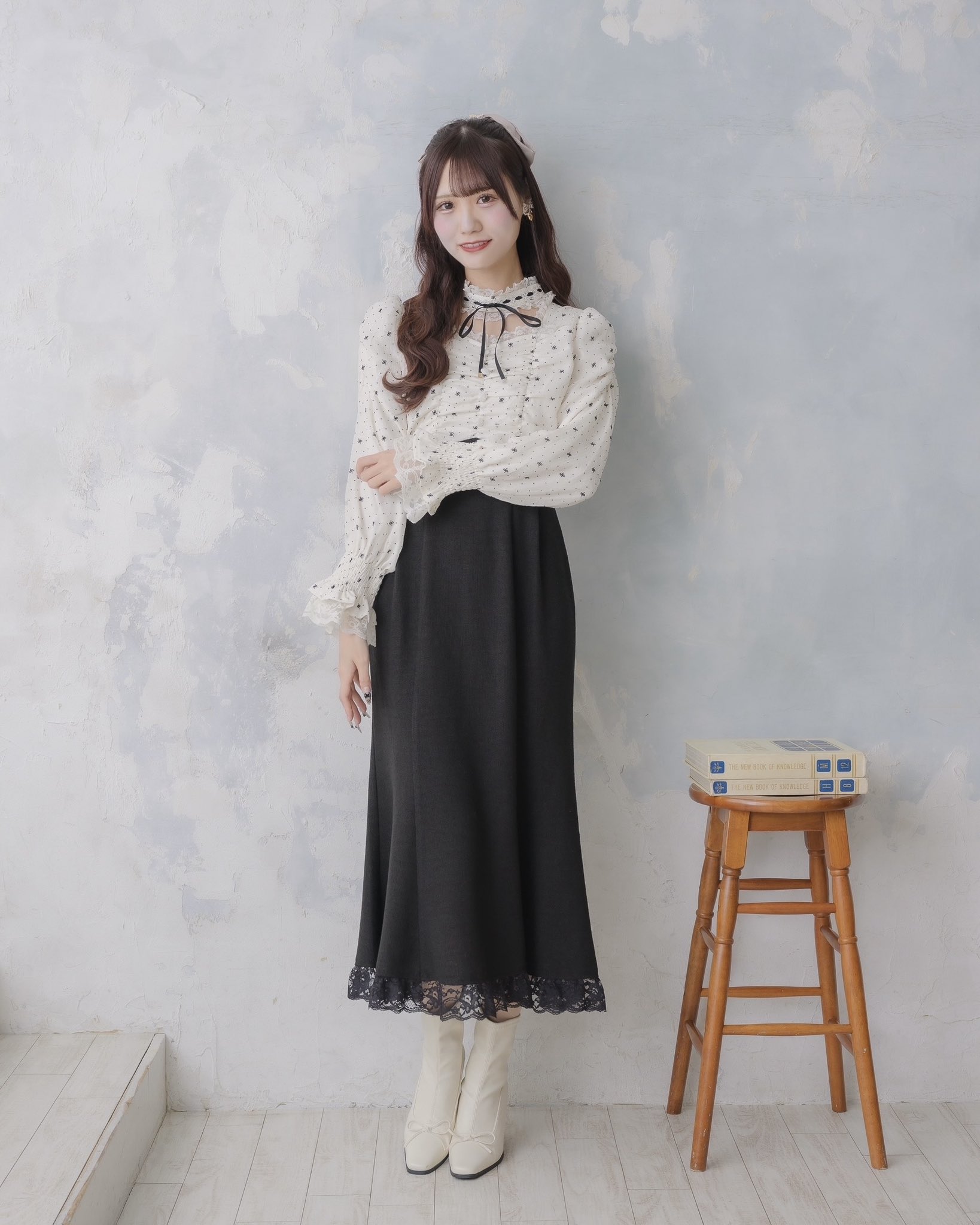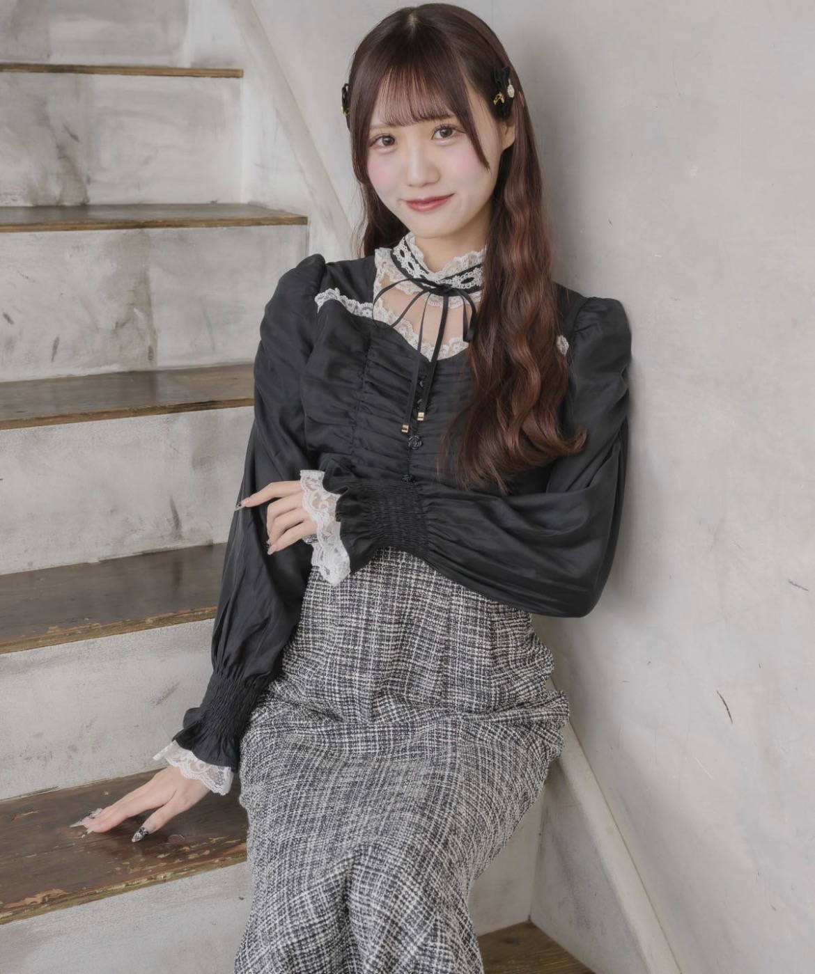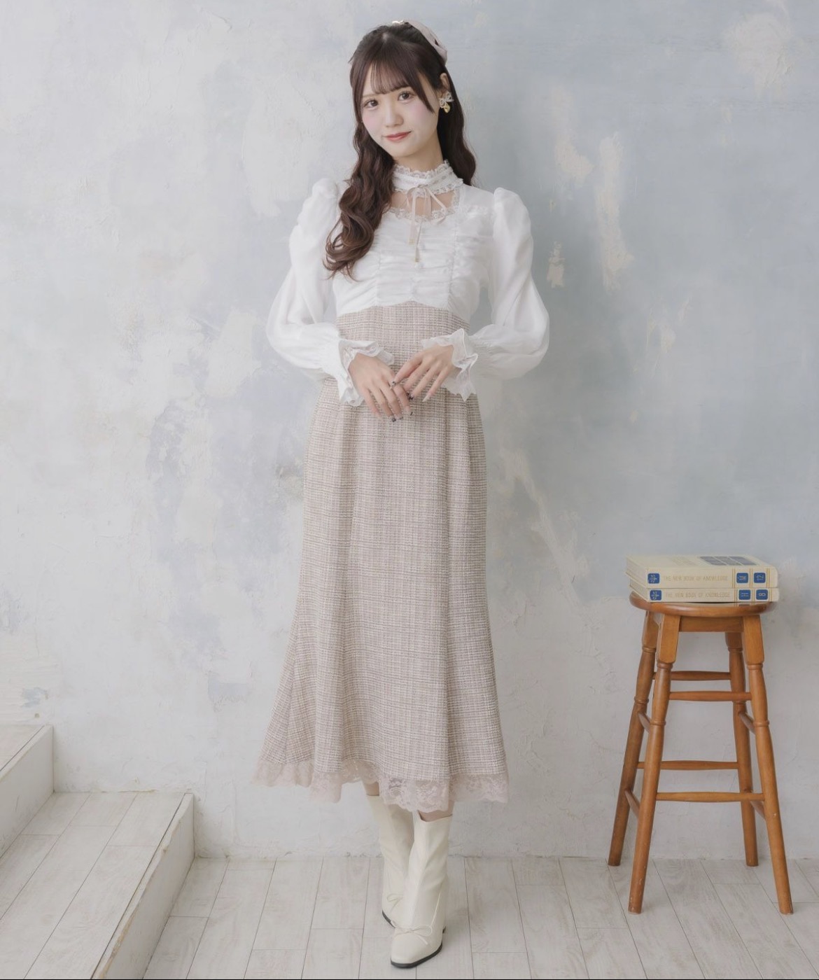 首元のフリルチョーカーには、はしごレーステープをあしらい、繊細で上品なアクセントをプラス♡前身頃にはたっぷりとギャザーを寄せ、柔らかな表情と立体感を演出します。ハイウエストで切り替えたマーメイドシルエットが、女性らしいラインを美しく際立たせるデザイン。スカート部分はツイード調素材を使用し、上品で季節感のある仕上がりに◎