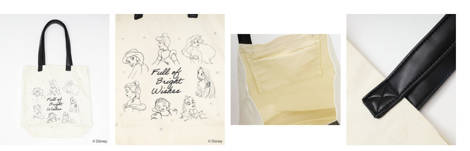 ディズニープリンセスたちの優雅なラインアートが描かれた、上品でかわいらしいトートバッグです。