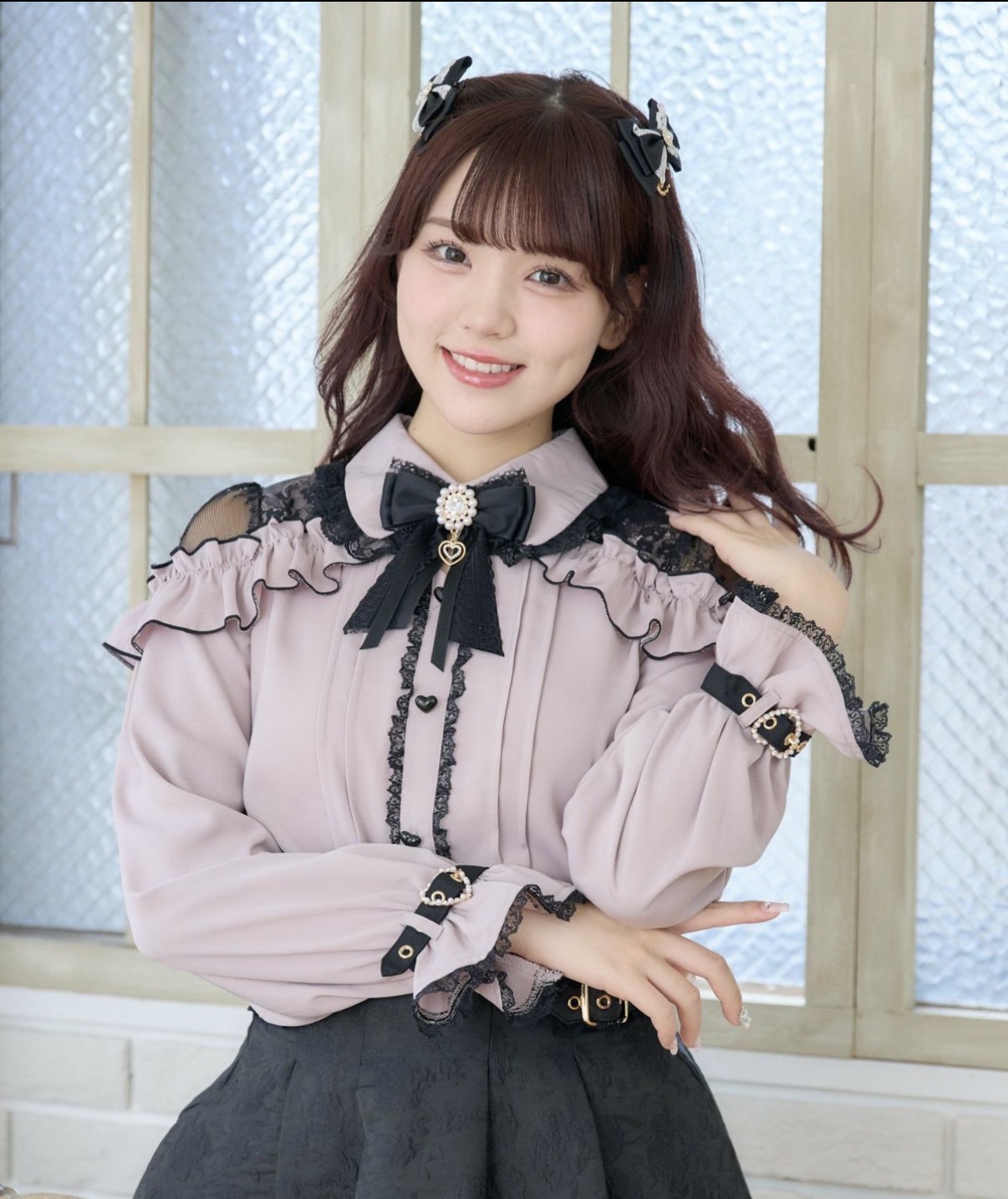 メローフリルがコーディネートを華やかに彩り、ショルダーに施されたレースが抜け感を演出するブラウス。ハート形の釦など、細部まで可愛さにこだわっているのもポイント◎袖口のベルトは地雷要素をプラスしてくれ、きゅっと絞った手元もお洒落映えすること間違いなし♪