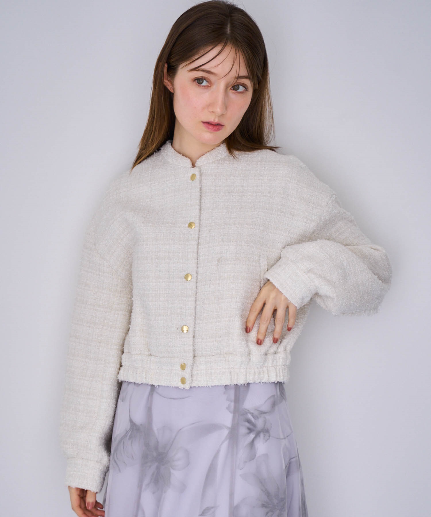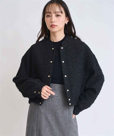 ショート丈のツイードブルゾンは、フリンジのアクセントが華やかな1枚です。