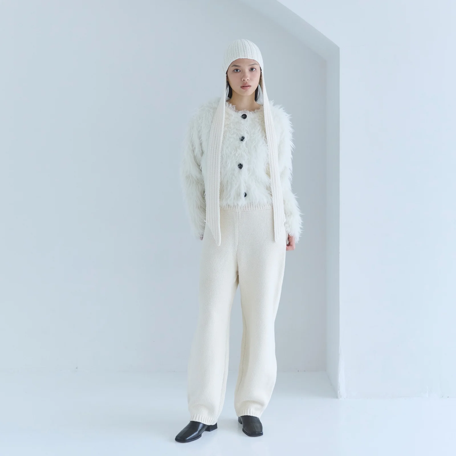 ウール混のブークレヤーン素材に特殊な起毛加工を施し、波打つような表情をプラス。柔らかく毛足の長い糸を使用しており、チクチク感のないソフトな肌触りに仕上げています。起毛糸の質感を最大限に活かすため、天竺編みの裏目を使用しています。