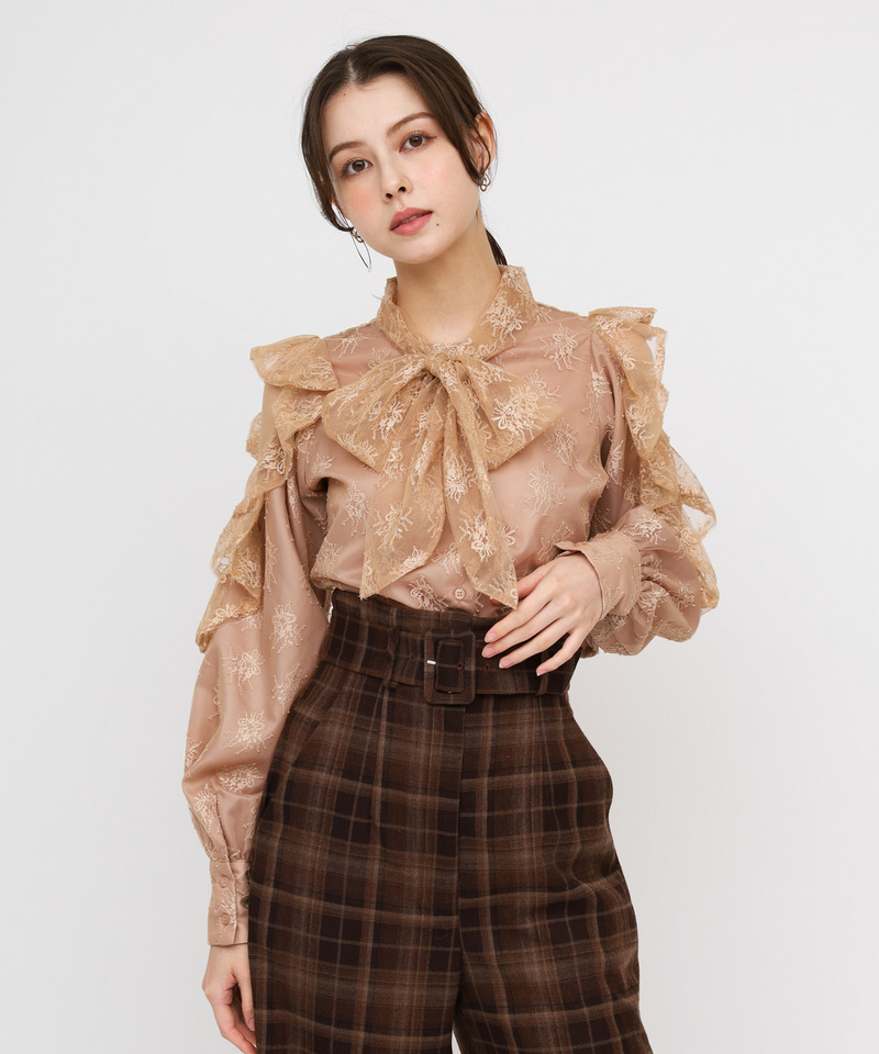 繊細なレースとリボンタイが華やかさをプラスし、上品で女性らしい印象に仕上げます。