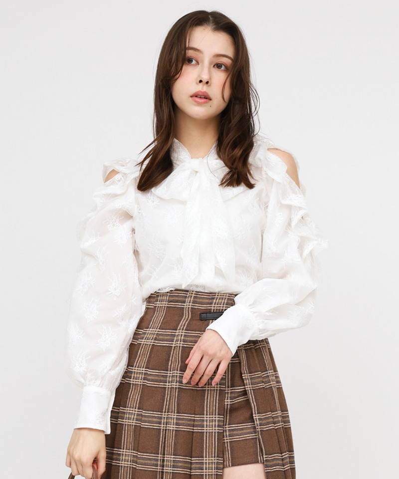 肩開きのデザインにラッフルをあしらった、フェミニンなコールドショルダーブラウス。