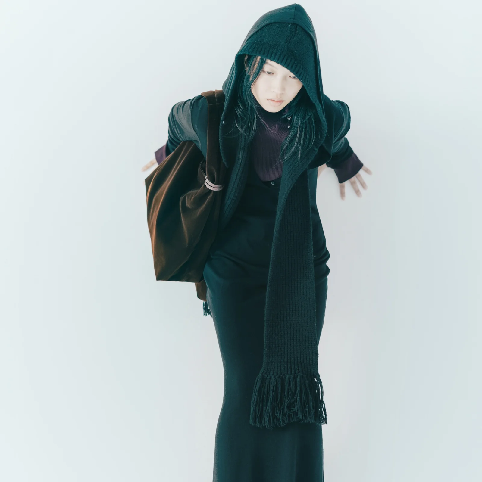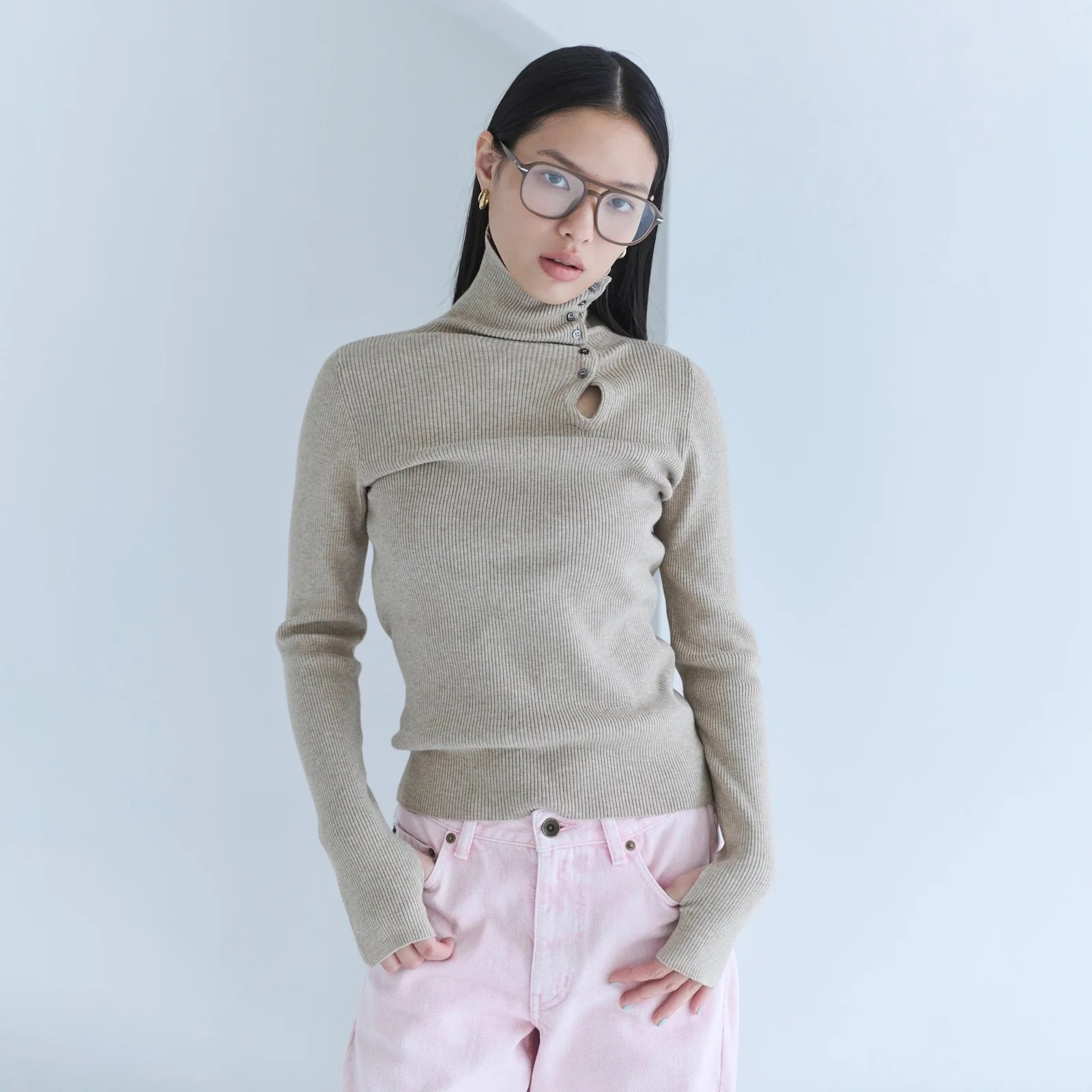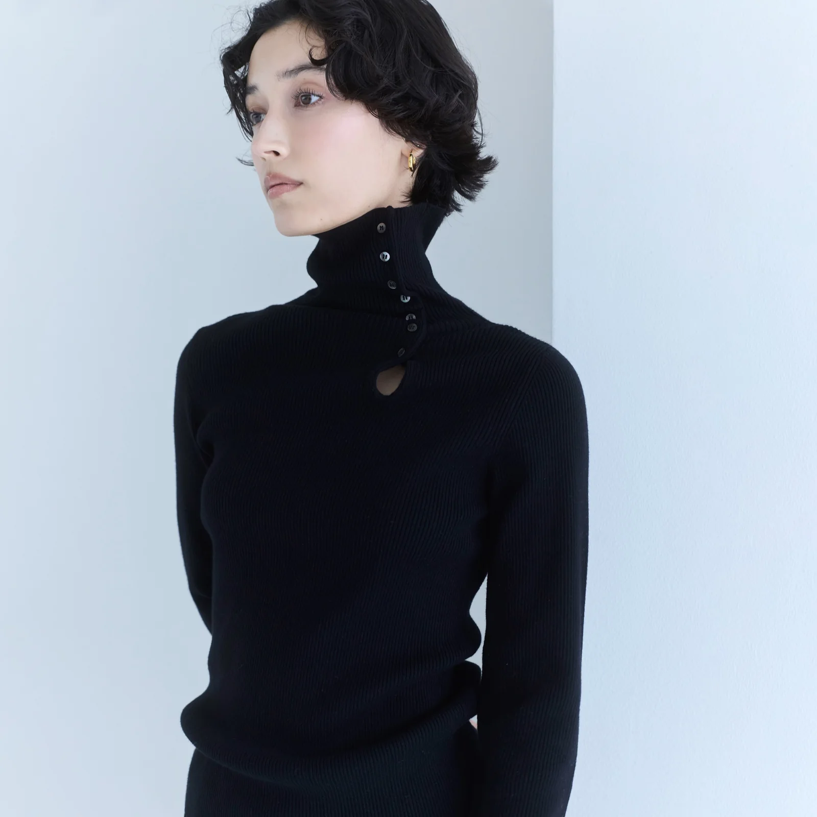 左首元に並んだ小さなシェルボタンと雫型のホールカットが上品なアクセントに。ボタンを留めればタートルネックとして、外せば襟のように開いた抜け感あるスタイルとして、2WAYで楽しめます。シンプルながらも顔周りにニュアンスを添える1枚です。