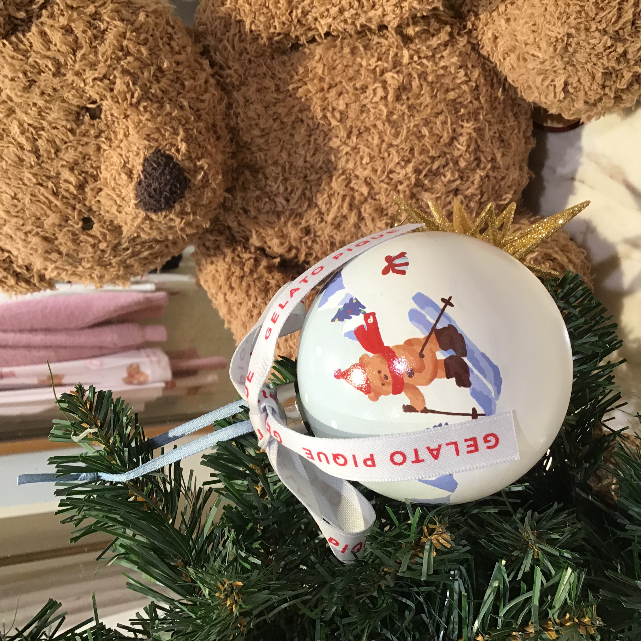 ルームウェアとお揃いのスキーベアの絵柄をプリントした、丸いオーナメント🧸