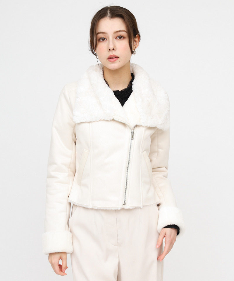 大人クールなスタイリングに決まる、フェイクムートンのライダースジャケット。