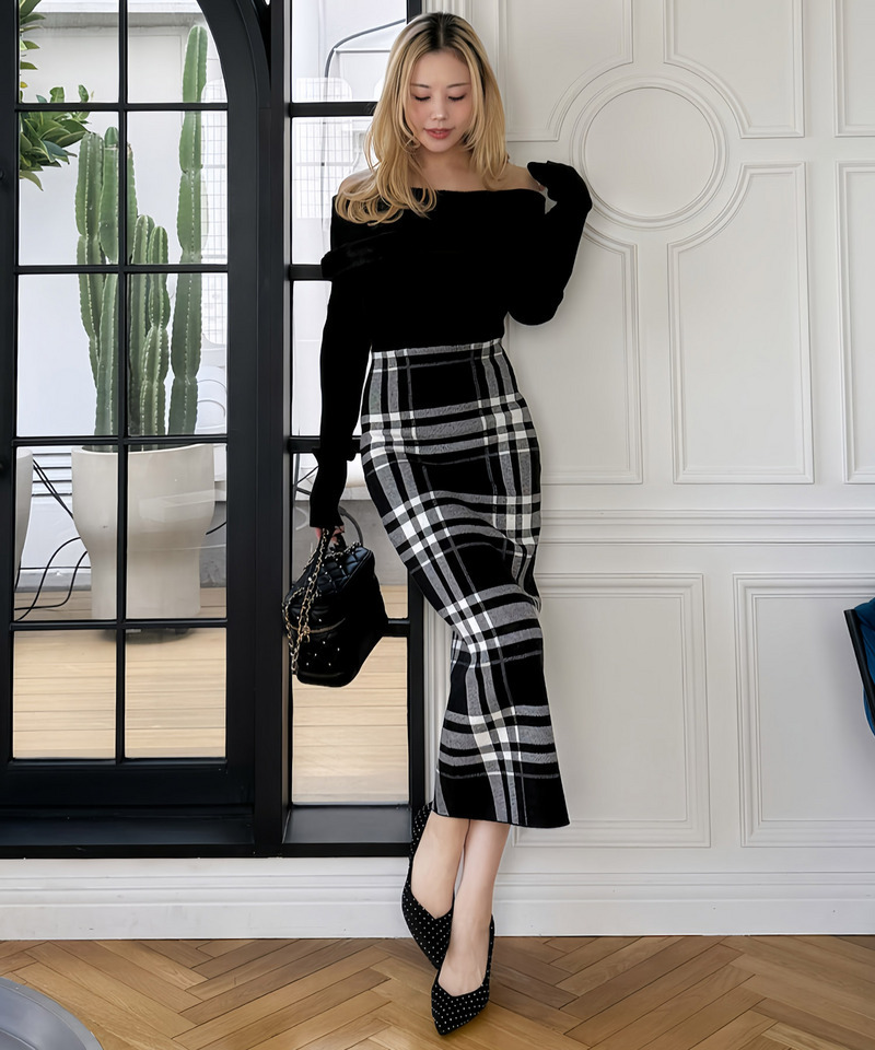 存在感溢れるチェックジャガードが目を惹くオフショルニットワンピース。