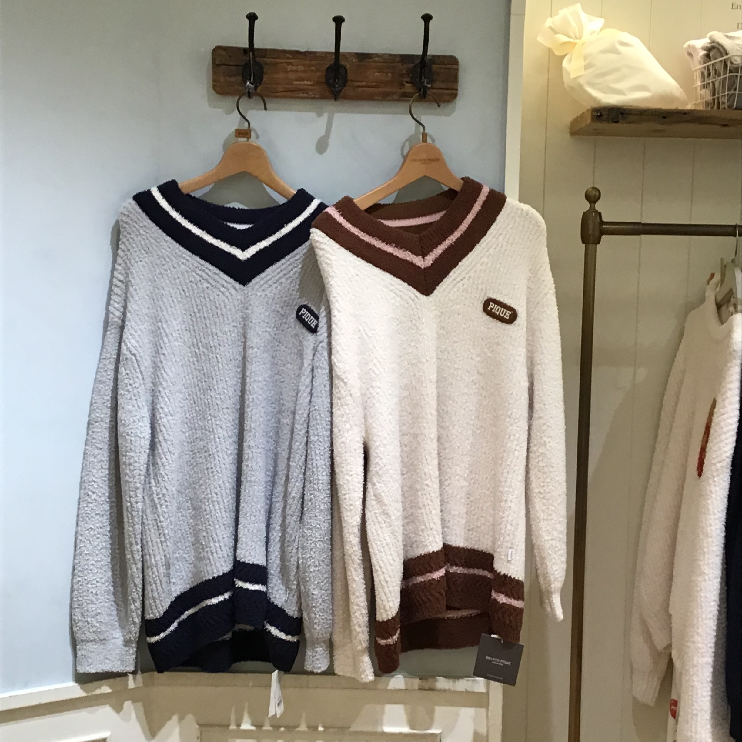 チルデンセーターをモチーフにしたラインと、胸元のワッペン風サガラ刺繍が目を引くプルオーバー✨温もりを感じさせるリブ目が心地良く、秋冬にちょうど良い浅めのVネックで仕上げました!