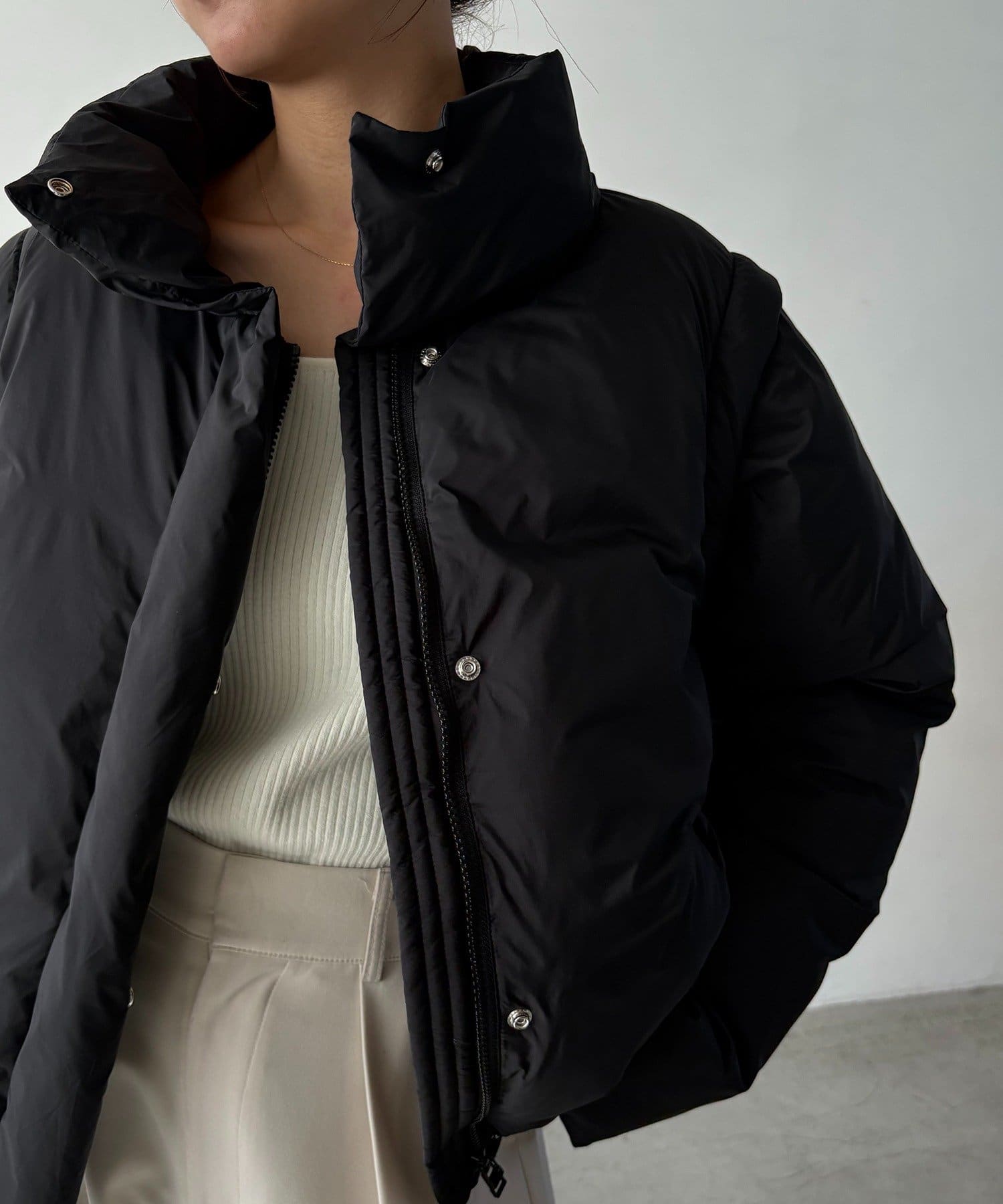袖を取り外してベストとしても着られる中綿ジャケット♡ 吸湿、放湿性に優れており、蒸れにくく心地よいアウター。 短丈でバランスのとりやすいアイテムです!