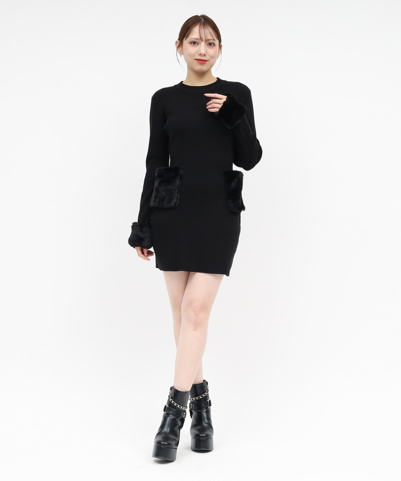 冬ムードを高めるファーポケットデザインが魅力のハイネックニットミニワンピース。